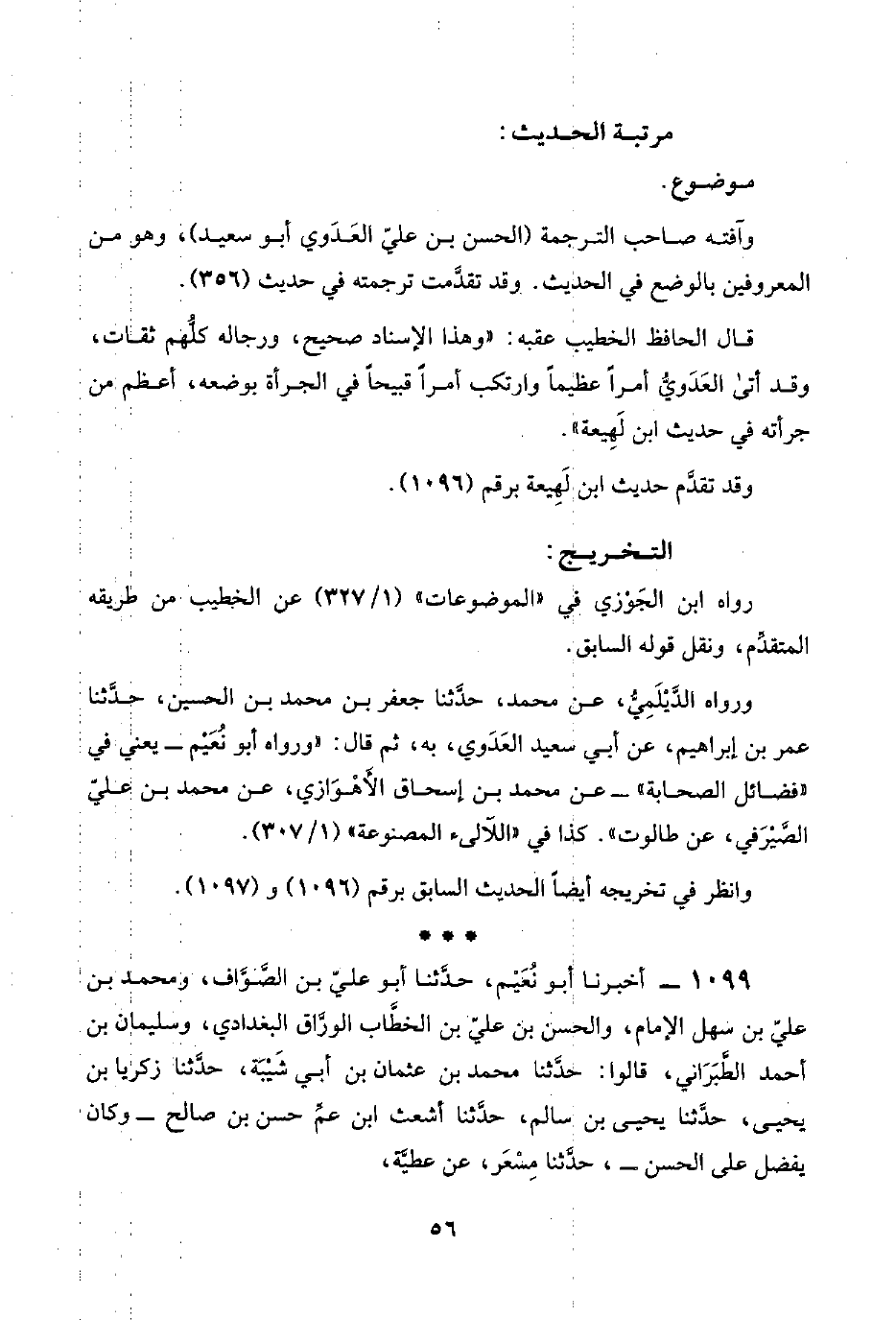 قال الحافظ الخطيب عقبه: "وهذا الإِسناد صحيح، ورجاله كلُّهم ثقات، وقد أتى العَدَويُّ أمرًا عظيمًا وارتكب أمرًا قبيحًا في الجرأة بوضعه، أعظم من جرأته في حديث ابن لَهِيعة".