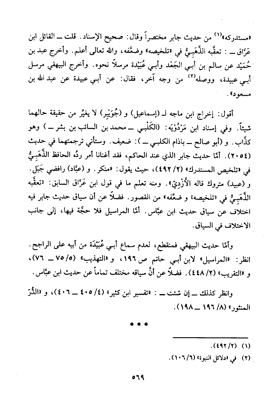 أقول: إخراج ابن ماجه لـ (إسماعيل) و (جُوَيْبِر) لا يغيِّر من حقيقة حالهما شيئًا. وفي إسناد ابن مَرْدُوْيَه: (الكَلْبي -محمد بن السائب بن بِشْر-) وهو كذَّاب. و (أبو صالح -باذام الكلبي-): ضعيف. وستأتي ترجمتهما في حديث (٢٠٥٤). أمَّا حديث جابر الذي عند الحاكم، فقد أغنانا أمر ردِّه الحافظ الذَّهَبِيُّ في "تلخيص المستدرك" (٢/ ٤٩٢)، حيث يقول: "منكر. و (عبَّاد) رافضي جَبَل. و (عبيد) متروك قاله الأَزْدِيّ". ومنه تعلم ما في قول ابن عَرَّاق السابق: "تعقَّبه الذَّهَبِيُّ في "تلخيصه" وضعَّفه" من القصور. فضلًا عن أن سياق حديث جابر فيه اختلاف عن سياق حديث ابن عبَّاس. أمَّا المراسيل فلا حجَّة فيها، إلى جانب الاختلاف في السياق.