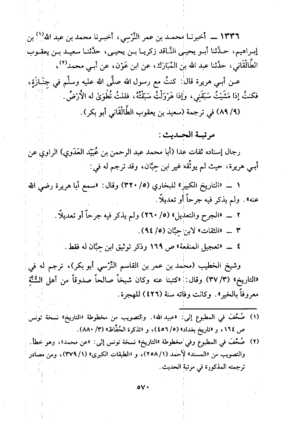 ١٣٣٦ - أخبرنا محمد بن عمر النَّرْسِي، أخبرنا محمد بن عبد اللَّه (¬١) بن إبراهيم، حدَّثنا أبو يحيى النَّاقد زكريا بن يحيى، حدَّثنا سعيد بن يعقوب الطَّالْقَاني، حدَّثنا عبد اللَّه بن المُبَارَك، عن ابن عَوْن، عن أبي محمد (¬٢)،