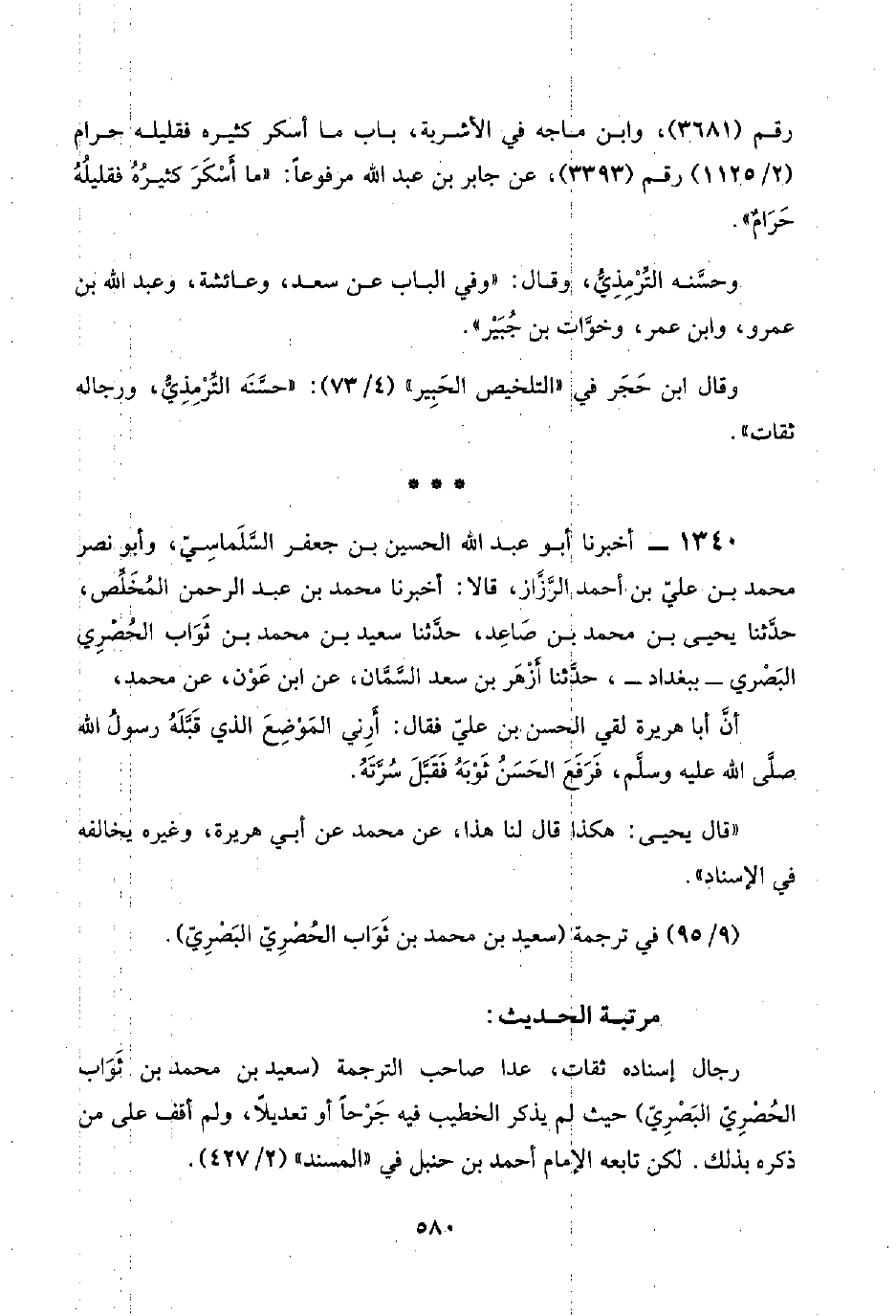 رجال إسناده ثقات، عدا صاحب الترجمة (سعيد بن محمد بن ثَوَاب الحُصْرِيّ البَصْرِيّ). حيث لم يذكر الخطيب فيه جَرْحًا أو تعديلًا، ولم أقف على من ذكره بذلك. لكن تابعه الإِمام أحمد بن حنبل في "المسند" (٢/ ٤٢٧).