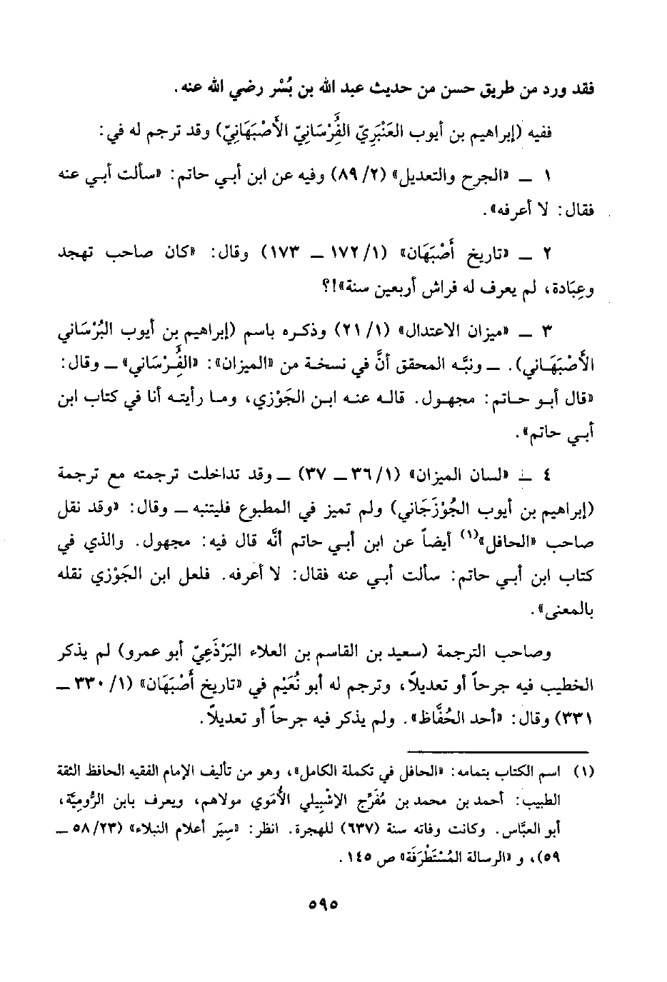 ٤ - "لسان الميزان" (١/ ٣٦ - ٣٧) -وقد تداخلت ترجمته مع ترجمة (إبراهيم بن أيوب الجُوْزَجَانِي) ولم تميَّز في المطبوع فليتنبه- وقال: "وقد نقل صاحب "الحافل" (¬١) أيضًا عن ابن أبي حاتم أنَّه قال فيه: مجهول. والذي في كتاب ابن أبي حاتم: سألت أبي عنه فقال: لا أعرفه. فلعل ابن الجَوْزي نقله بالمعنى".