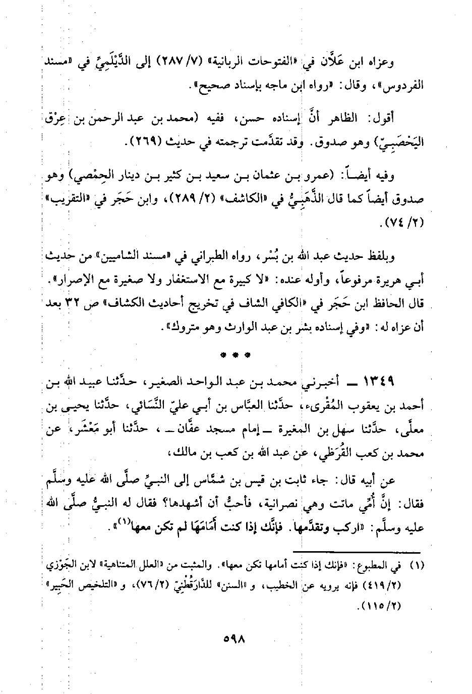 ١٣٤٩ - أخبرني محمد بن عبد الواحد الصغير، حدَّثنا عبيد اللَّه بن أحمد بن يعقوب المُقْرِئ حدَّثنا العبَّاس بن أبي عليّ النَّسائي، حدَّثنا يحيى بن معلَّى، حدَّثنا سهل بن المغيرة -إمام مسجد عفَّان-، حدَّثنا أبو مَعْشَر عن محمد بن كعب القُرَظي، عن عبد اللَّه بن كعب بن مالك،