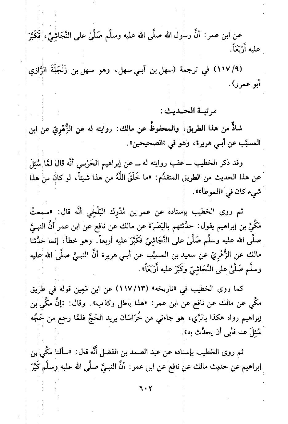 ثم روى الخطيب بإسناده عن عمر بن مُدْرك البَلْخِي أنَّه قال: "سمعتُ مَكِّيَّ بن إبراهيم يقول: حدثتهم بالبَصْرَة عن مالك عن نافع عن ابن عمر أنَّ النبيَّ صلَّى اللَّه عليه وسلَّم صلَّى على النَّجَاشِيِّ فَكَبَّرَ عليه أربعًا. وهو خطأ، إنَّما حدَّثنا مالك عن الزُّهْرِيّ عن سعيد بن المسيَّب عن أبي هريرة أنَّ النبيَّ صلَّى اللَّه عليه وسلَّم صلَّى على النَّجَاشِيّ وكَبَّرَ عليه أَرْبَعًا".
