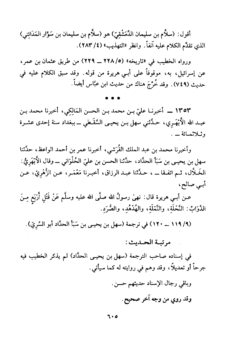 ١٣٥٣ - أخبرنا عليّ بن محمد بن الحسن المَالِكِي، أخبرنا محمد بن عبد اللَّه الأَبْهَريّ، حدَّثني سهل بن يحيى السَّقَطي -ببغداد سنة إحدى عشرة وثلاثمائة-.