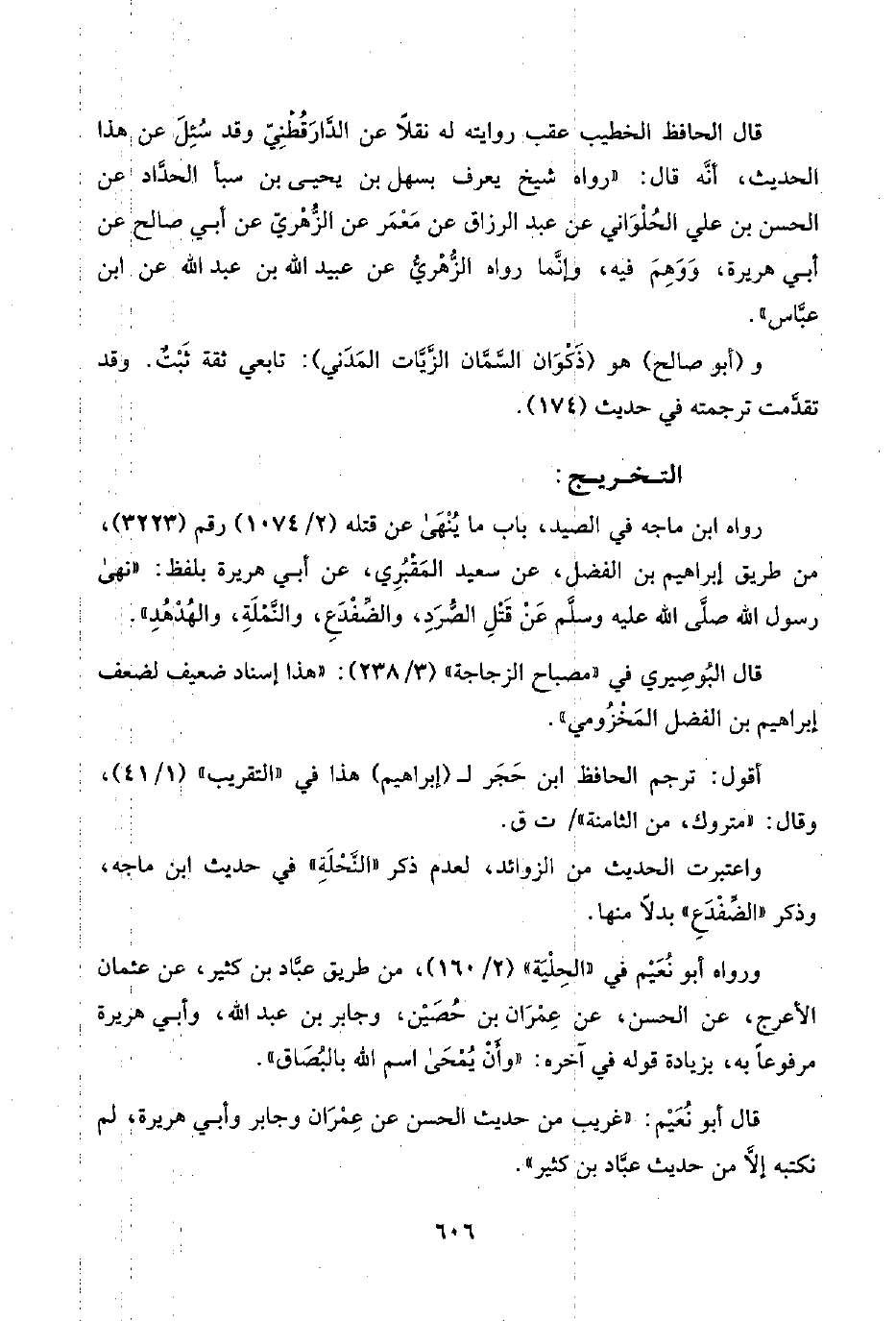 رواه ابن ماجه في الصيد، باب ما يُنْهَى عن قتله (٢/ ١٠٧٤) رقم (٣٢٢٣)، من طريق إبراهيم بن الفضل، عن سعيد المَقْبُرِي، عن أبي هريرة بلفظ: "نهى رسول اللَّه صلَّى اللَّه عليه وسلَّم عَنْ قَتْلِ الصُّرَدِ، والضِّفْدَعِ، والنَّمْلَةِ، والهُدْهُدِ".