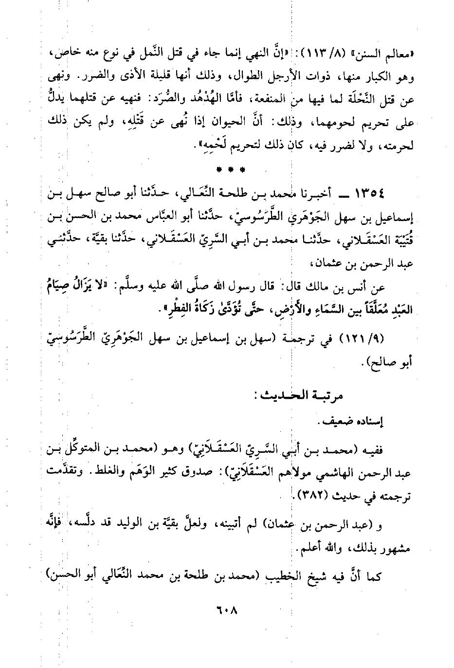 ١٣٥٤ - أخبرنا محمد بن طلحة النِّعَالي، حدَّثنا أبو صالح سهل بن إسماعيل بن سهل الجَوْهَرِيّ الطَّرَسُوسيّ، حدَّثنا أبو العبَّاس محمد بن الحسن بن قُتَيْبَة العَسْقَلَانِيّ، حدَّثنا محمد بن أبي السَّرِيّ العَسْقَلَانِيّ، حدَّثنا بقيَّة، حدَّثني عبد الرحمن بن عثمان،