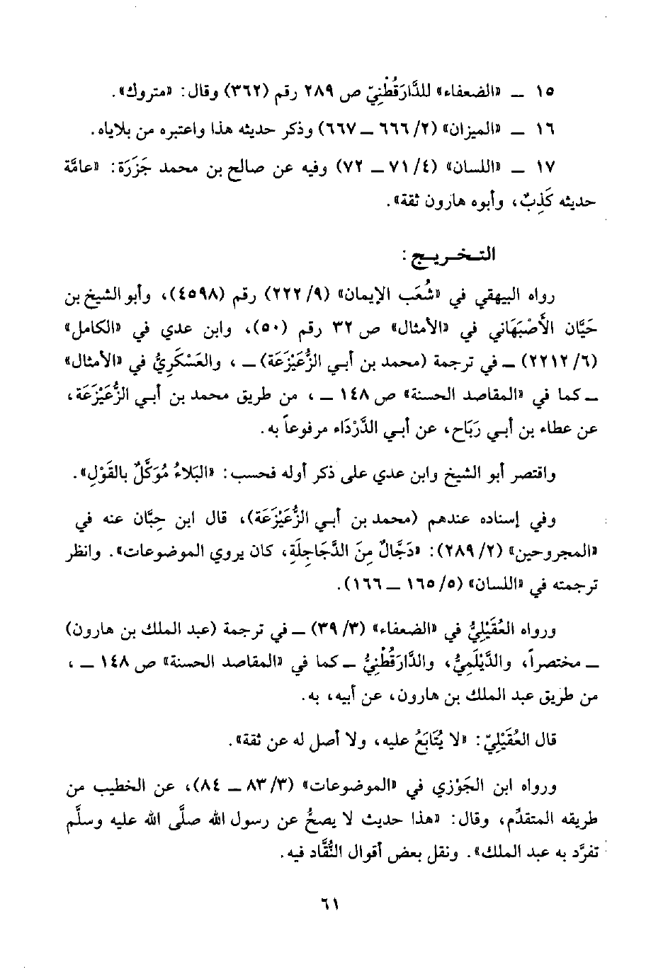١٦ - "الميزان" (٢/ ٦٦٦ - ٦٦٧) وذكر حديثه هذا واعتبره من بلاياه.