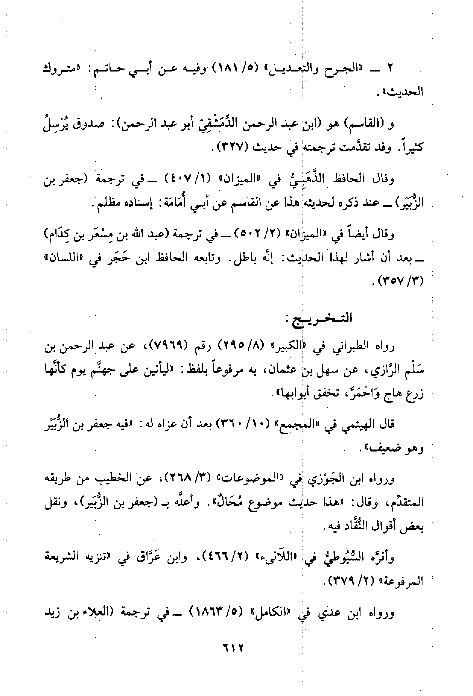وقال الحافظ الذَّهَبِيُّ في "الميزان" (١/ ٤٠٧) -في ترجمة (جعفر بن الزُّبَيْر) - عند ذكره لحديثه هذا عن القاسم عن أبي أُمَامَة: إسناده مظلم.