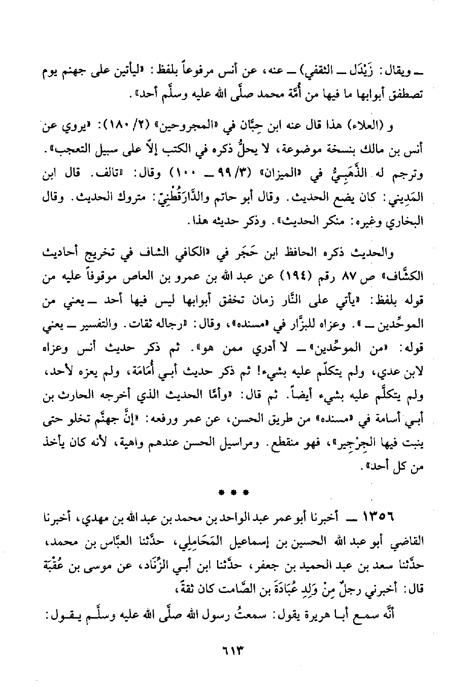 والحديث ذكره الحافظ ابن حَجَر في "الكافي الشاف في تخريج أحاديث الكشَّاف" ص ٨٧ رقم (١٩٤) عن عبد اللَّه بن عمرو بن العاص موقوفًا عليه من قوله بلفظ: "يأتي على النار زمان تخفق أبوابها ليس فيها أحد -يعني من الموحِّدين-". وعزاه للبزَّار في "مسنده"، وقال: "رجاله ثقات. والتفسير -يعني قوله: "من الموحِّدين- لا أدري ممن هو". ثم ذكر حديث أنس وعزاه لابن عدي، ولم يتكلّم عليه بشيء! ثم ذكر حديث أبي أُمَامَة، ولم يعزه لأحد، ولم يتكلَّم عليه بشيء أيضًا. ثم قال: "وأمَّا الحديث الذي أخرجه الحارث بن أبي أسامة في "مسنده" من طريق الحسن، عن عمر ورفعه: "إنَّ جهنَّم تخلو حتَّى ينبت فيها الجِرْجِير"، فهو منقطع. ومراسيل الحسن عندهم واهية، لأنَّه كان يأخذ من كل أحد".