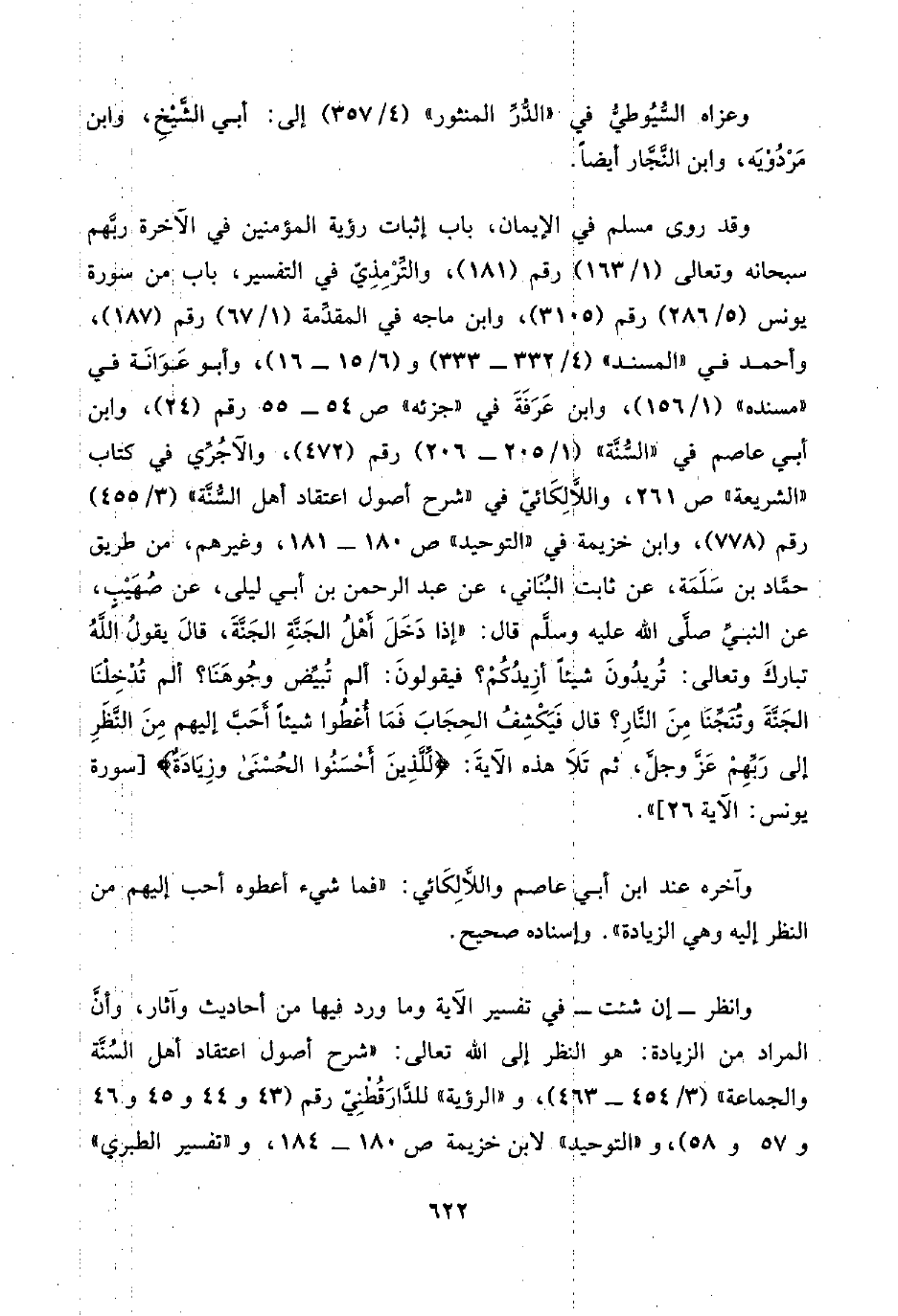 وانظر -إن شئت- في تفسير الآية وما وَرَدَ فيها من أحاديث وآثار، وأنَّ المراد من الزيادة: هو النظر إلى اللَّه تعالى: "شرح أصول اعتقاد أهل السُّنَّة والجماعة" (٣/ ٤٥٤ - ٤٦٣)، و"الرؤية" للدَّارَقُطْنِيّ رقم (٤٣ و ٤٤ و ٤٥ و ٤٦ و ٥٧ و ٥٨)، و"التوحيد" لابن خُزَيْمَة ص ١٨٠ - ١٨٤، و"تفسير الطبري"