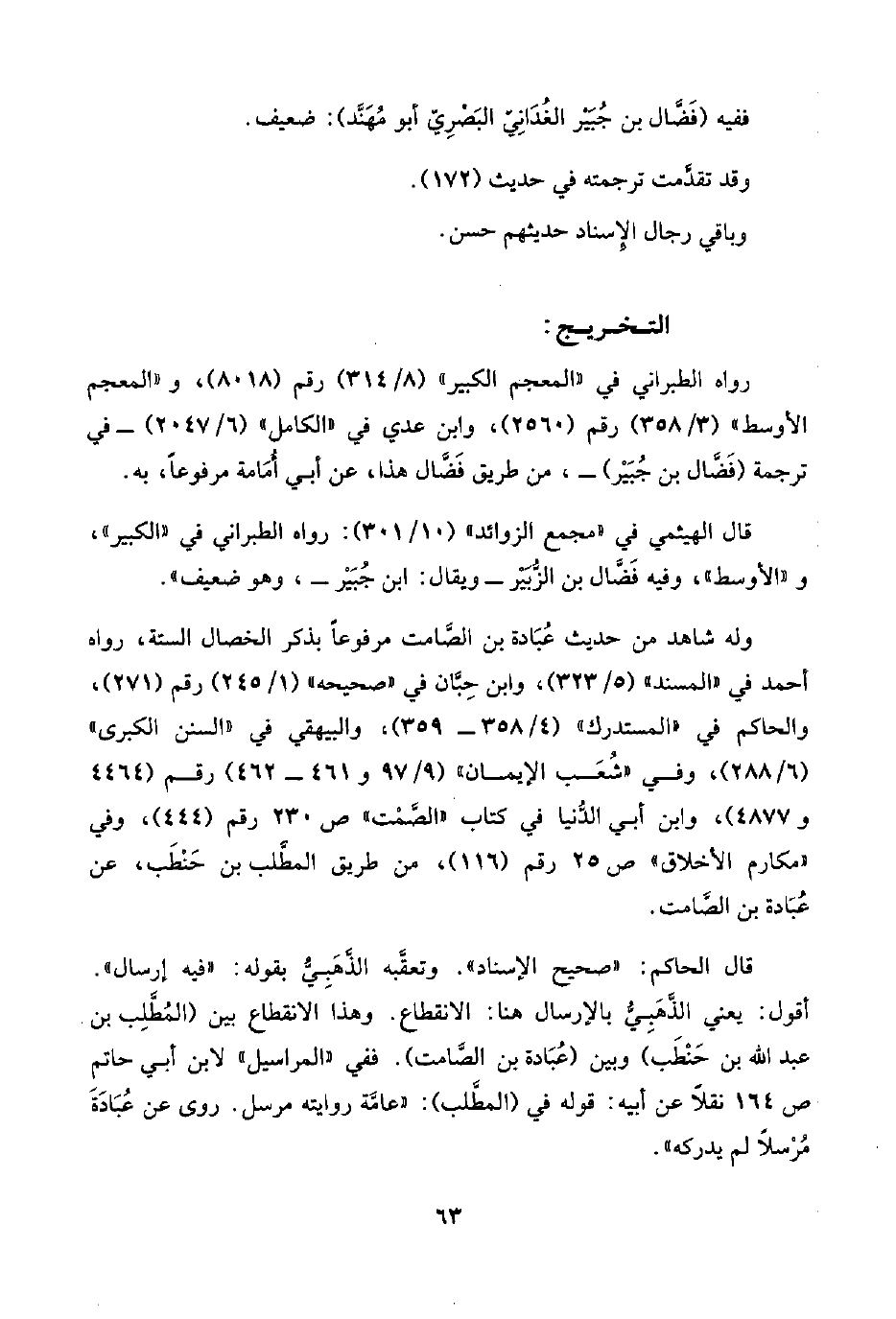 قال الهيثمي في "مجمع الزوائد" (١٠/ ٣٠١): رواه الطبراني في "الكبير"، و"الأوسط"، وفيه فَضَّال بن الزُّبَيْر -ويقال: ابن جُبَيْر-، وهو ضعيف".