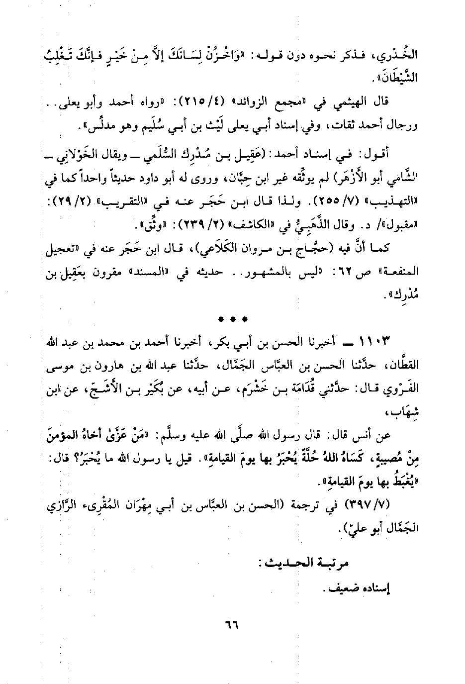 ١١٠٣ - أخبرنا الحسن بن أبي بكر، أخبرنا أحمد بن محمد بن عبد اللَّه القَطَّان، حدَّثنا الحسن بن العبَّاس الجَمَّال، حدَّثنا عبد اللَّه بن هارون بن موسى الفَرْوي قال: حدَّثني قُدَامَة بن خَشْرَم، عن أبيه، عن بُكَيْر بن الأَشَجّ، عن ابن شِهَاب،