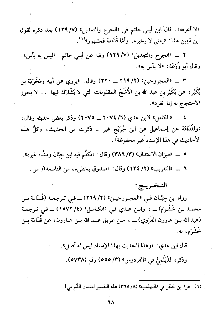٤ - "الكامل" لابن عدي (٦/ ٢٠٧٤ - ٢٠٧٥) وذكر بعض حديثه وقال: "ولقُدَامَة عن إسماعيل عن ابن جُرَيْج غير ما ذكرت من الحديث، وكلُّ هذه الأحاديث في هذا الإِسناد غير محفوظة".