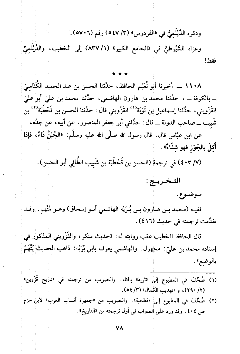 ١١٠٨ - أخبرنا أبو نُعَيْم الحافظ، حدَّثنا الحسن بن عبد الحميد الكُنَاسِيّ -بالكوفة-، حدَّثنا محمد بن هارون الهاشمي، حدَّثنا محمد بن عليّ أبو عليّ القَزْويني، حدَّثنا إسماعيل بن تَوْبَة (¬١) القَزْويني قال: حدَّثنا الحسن بن قَحْطَبَة (¬٢) بن شَبِيب -صاحب الدولة- قال: حدَّثني أبو جعفر المنصور، عن أبيه، عن جدِّه،
