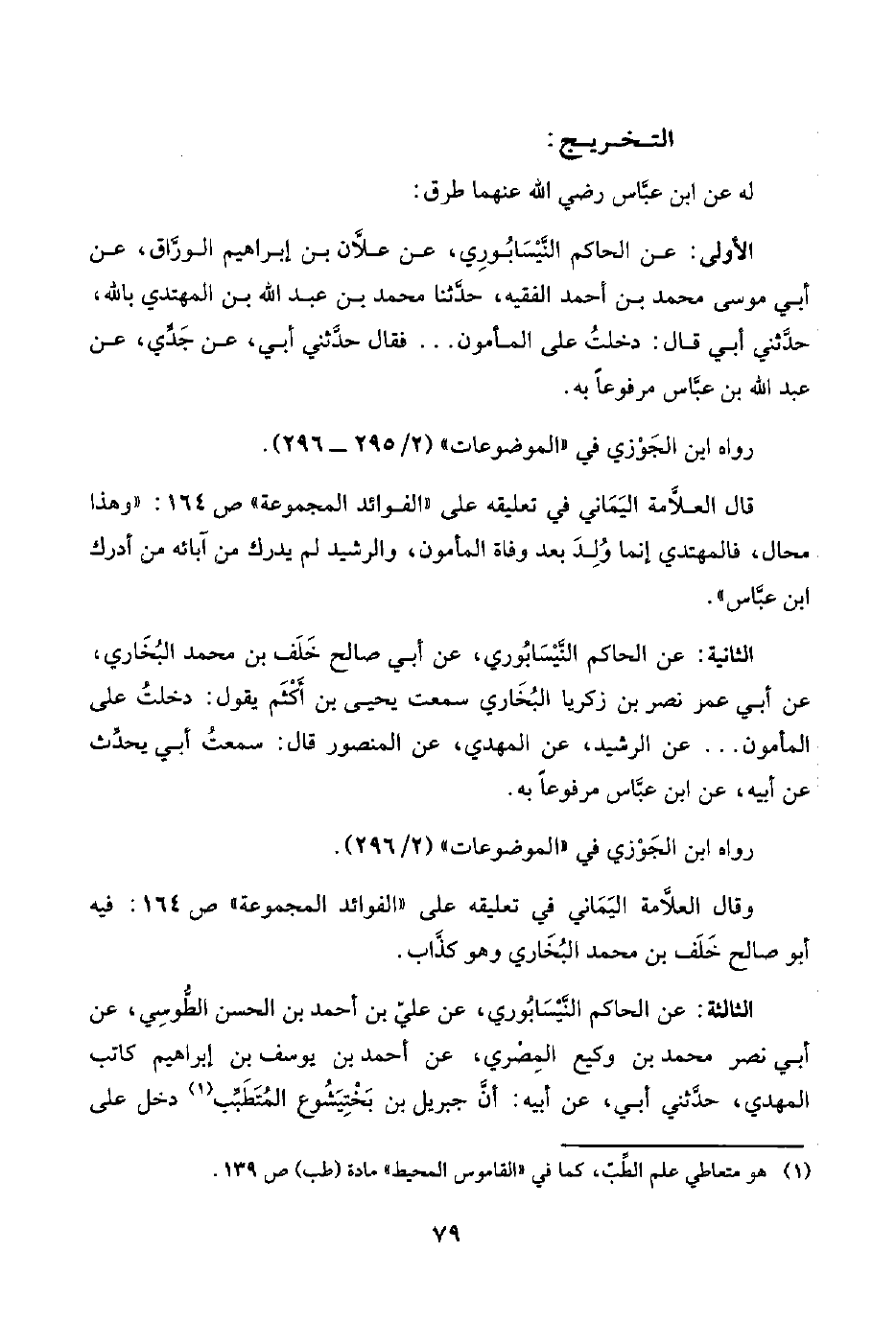 الأولى: عن الحاكم النَّيْسَابُورِي، عن علَّان بن إبراهيم الورَّاق، عن أبي موسى محمد بن أحمد الفقيه، حدَّثنا محمد بن عبد اللَّه بن المهتدي باللَّه، حدَّثني أبي قال: دخلتُ على المأمون. . . فقال حدَّثني أبي، عن جَدِّي، عن عبد اللَّه بن عبَّاس مرفوعًا به.