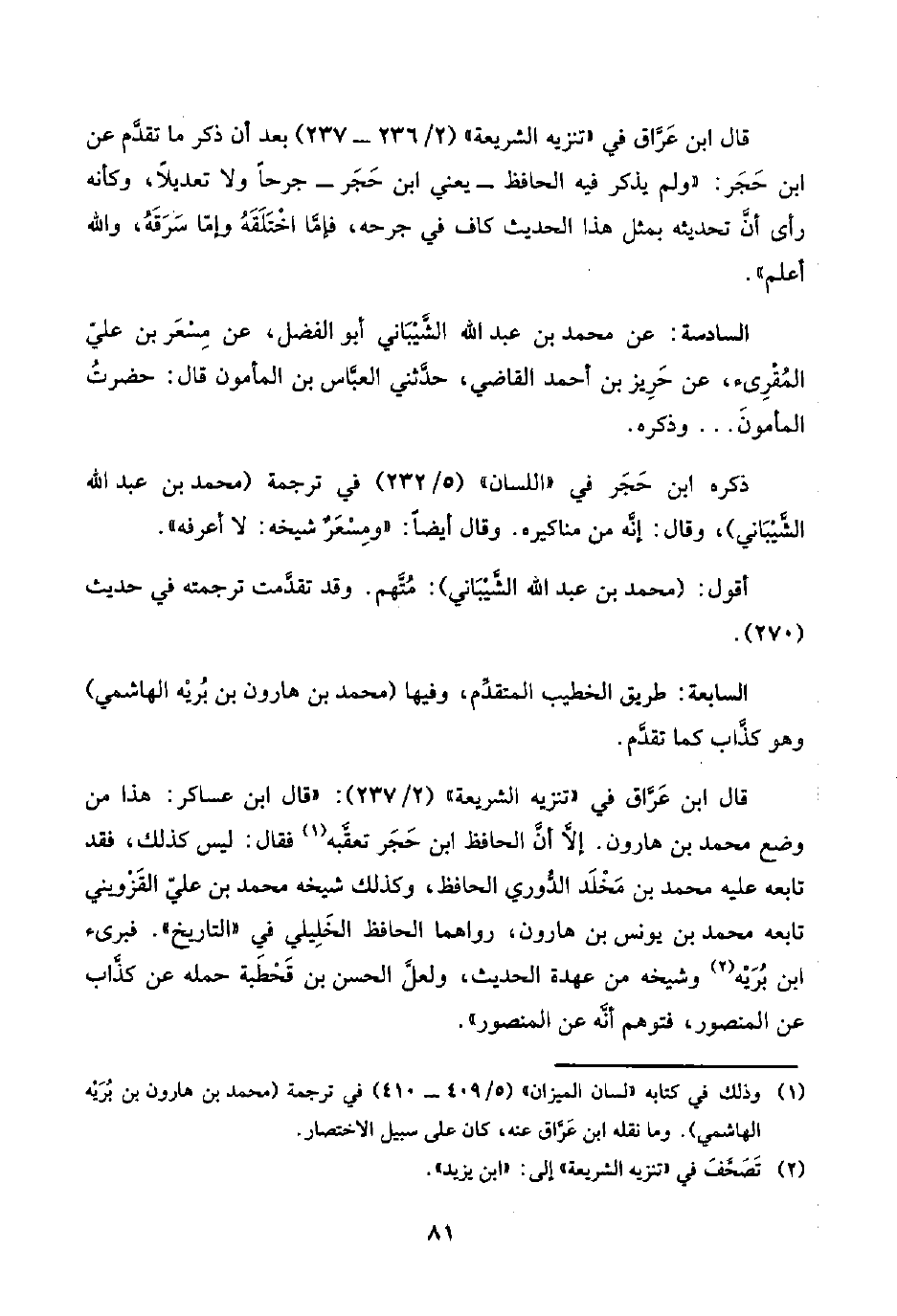 (¬١) وذلك في كتابه "لسان الميزان" (٥/ ٤٠٩ - ٤١٠) في ترجمة (محمد بن هارون بن بُرَيْه الهاشمي)، وما نقله ابن عَرَّاق عنه، كان على سبيل الاختصار.