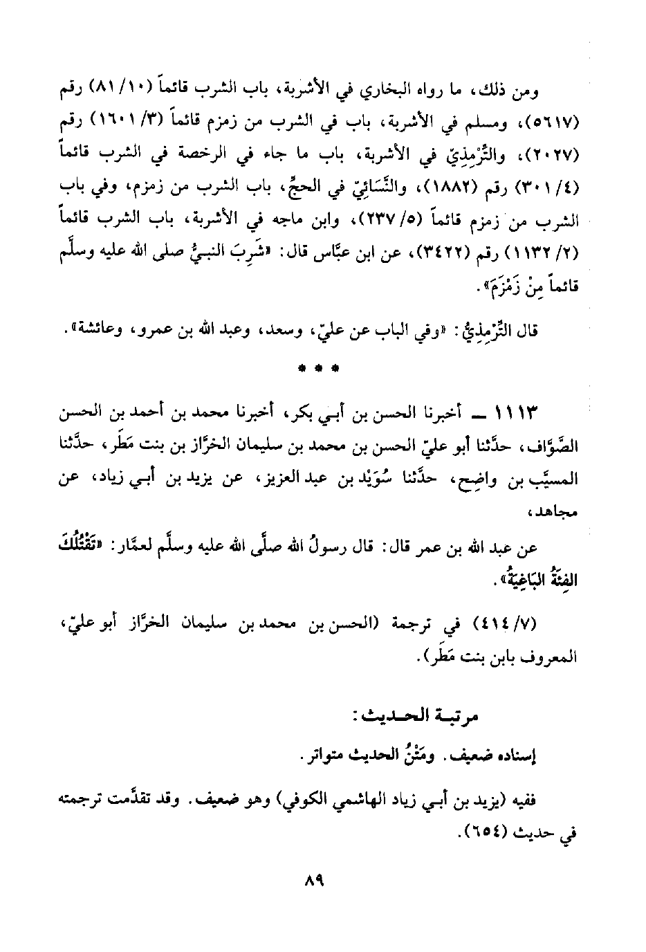 ١١١٣ - أخبرنا الحسن بن أبي بكر، أخبرنا محمد بن أحمد بن الحسن الصَّواف، حدَّثنا أبو عليّ الحسن بن محمد بن سليمان الخرَّاز بن بنت مَطَر، حدَّثنا المسيَّب بن واضِح، حدَّثنا سُوَيْد بن عبد العزيز، عن يزيد بن أبي زياد، عن مجاهد،