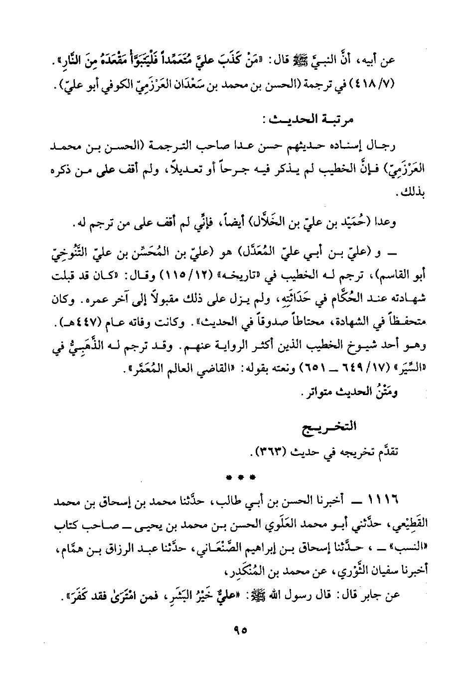 ١١١٦ - أخبرنا الحسن بن أبي طالب، حدَّثنا محمد بن إسحاق بن محمد القَطِيْعي، حدَّثني أبو محمد العَلَوي الحسن بن محمد بن يحيى -صاحب كتاب "النسب"-، حدَّثنا إسحاق بن إبراهيم الصَّنْعَاني، حدَّثنا عبد الرزاق بن همَّام، أخبرنا سفيان الثَّوْري، عن محمد بن المُنْكَدِر،