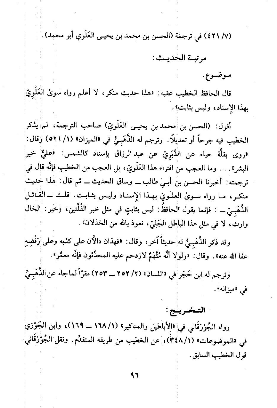 أقول: (الحسن بن محمد بن يحيى العَلَويّ) صاحب الترجمة، لم يذكر الخطيب فيه جرحًا أو تعديلًا. وترجم له الذَّهبِيُّ في "الميزان" (١/ ٥٢١) وقال: "روى بقلَّة حياء عن الدَّبَرِيّ عن عبد الرزاق بإسناد كالشمس: "عليٌّ خير البشر". . . وما العجب من افتراء هذا العَلَويّ، بل العجب من الخطيب فإنَّه قال في ترجمته: أخبرنا الحسن بن أبي طالب -وساق الحديث- ثم قال: هذا حديث منكر، ما رواه سوى العلويّ بهذا الإسناد وليس بثابت. قلت -القائل الذَّهَبِيّ-: فإنما يقول الحافظُ: ليس بثابتٍ في مثل خبر القُلَّتين، وخبر: الخال وارث، لا في مثل هذا الباطل الجَلِيّ، نعوذ باللَّه من الخذلان".