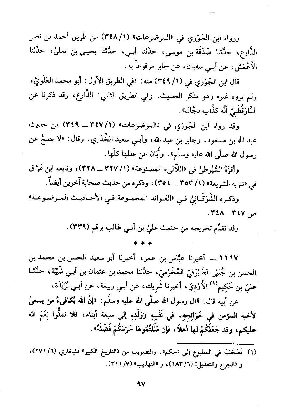 قال ابن الجَوْزي في (١/ ٣٤٩) منه: "في الطريق الأول: أبو محمد العَلَويّ، ولم يروه غيره وهو منكر الحديث. وفي الطريق الثاني: الذَّارع، وقد ذكرنا عن الدَّارَقُطْنِيّ أنَّه كذَّاب دجَّال".