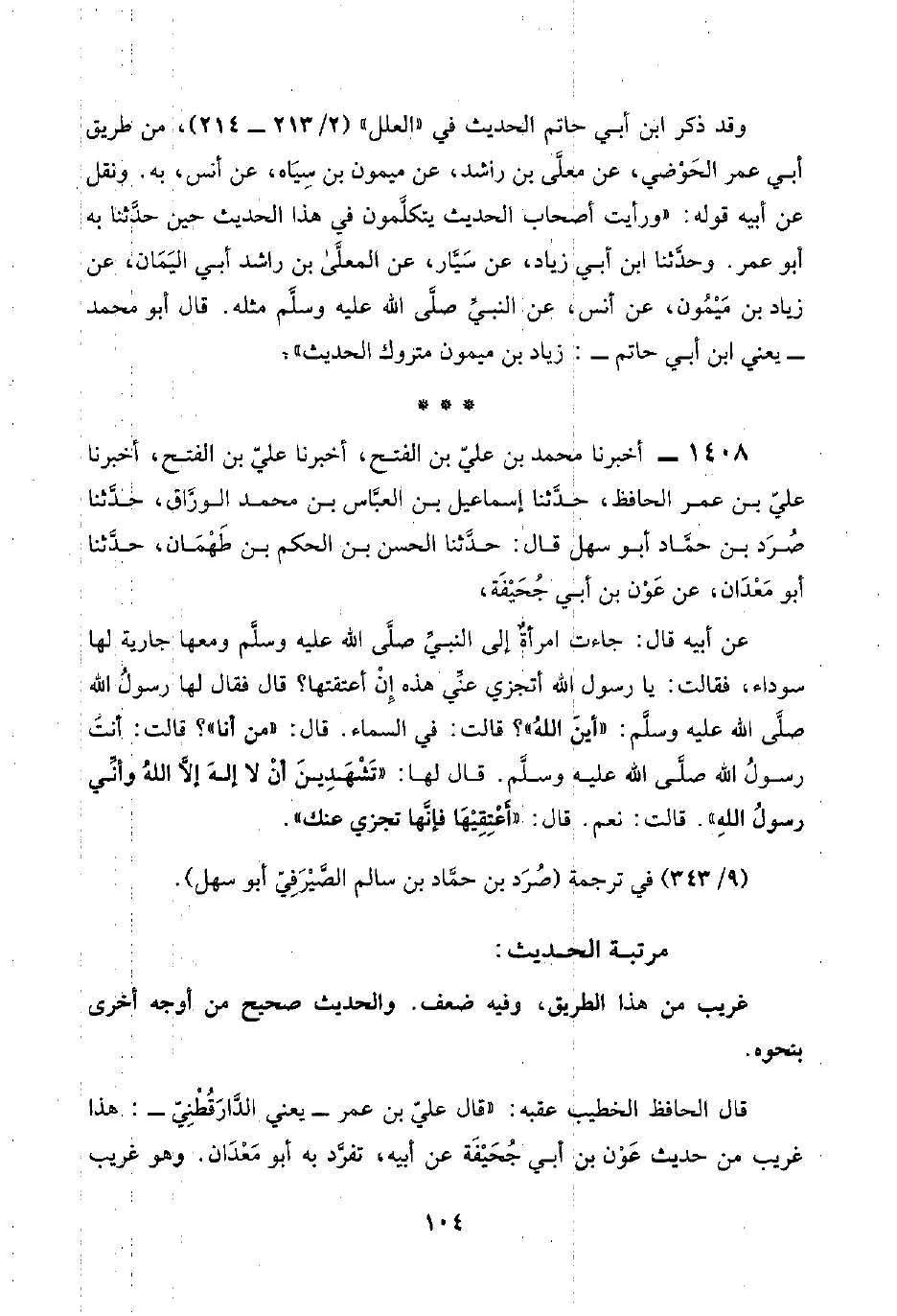 ١٤٠٨ - أخبرنا محمد بن عليّ بن الفتح، أخبرنا عليّ بن الفتح، أخبرنا عليّ بن عمر الحافظ، حدَّثنا إسماعيل بن العبَّاس بن محمد الورَّاق، حدَّثنا صُرَد بن حمَّاد أبو سهل قال: حدَّثنا الحسن بن الحكم بن طَهَمَان، حدَّثنا أبو مَعْدَان، عن عَوْن بن أبي جُحَيْفَة،