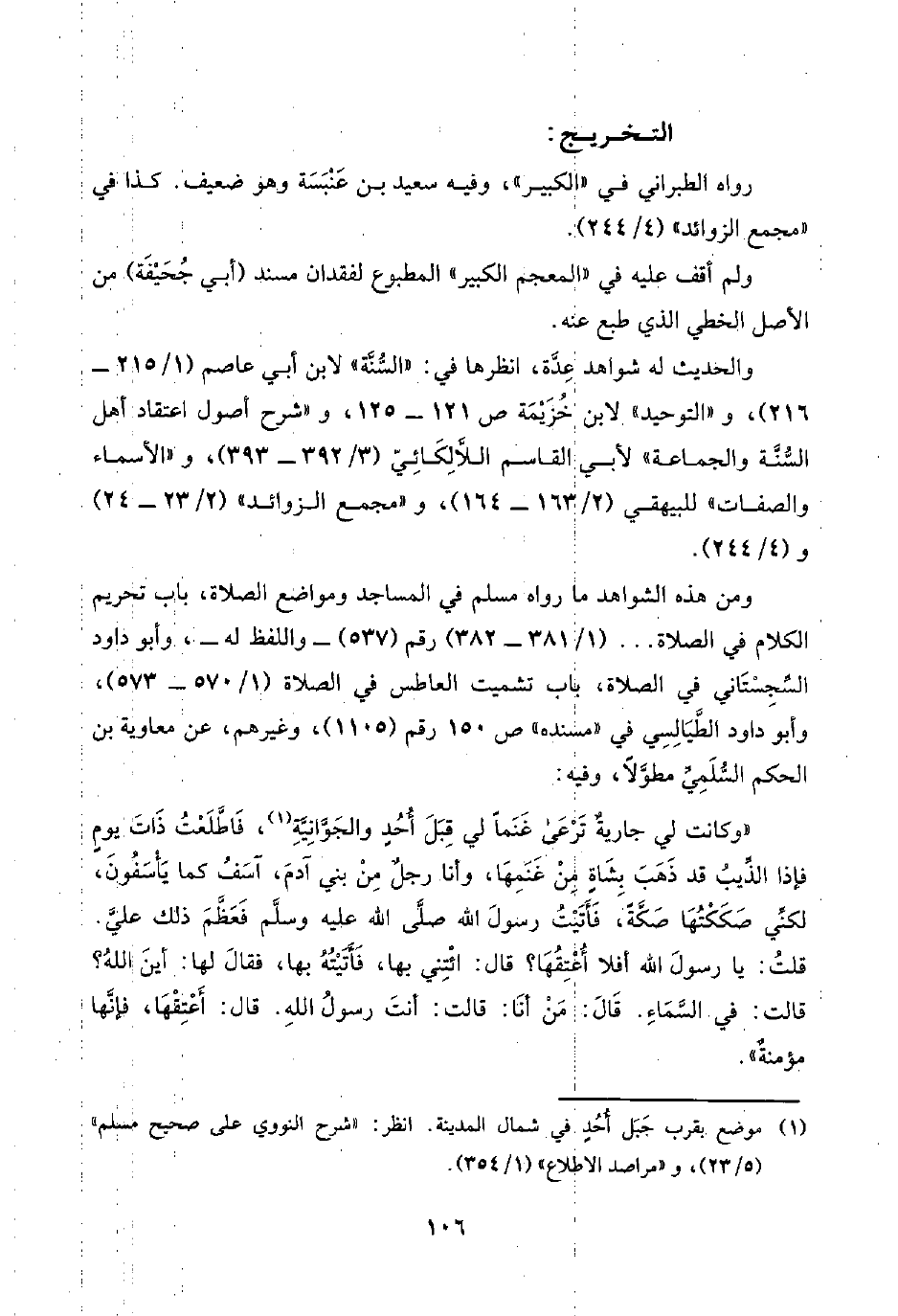 "وكانت لي جاريةٌ تَرْعَى غَنَمًا لي قِبَلَ أُحُدٍ والجَوَّانِيَّةِ (¬١)، فَاطَّلَعْتُ ذَاتَ يومٍ فإذا الذِّيبُ قد ذَهَبَ بَشَاةٍ مِنْ غَنَمِهَا، وأنا رجلٌ مِنْ بني آدمَ، آسَفُ كما يَأْسَفُونَ، لكنِّي صَكَكْتُهَا صَكَّةً، فَأَتَيْتُ رسولَ اللَّه صلَّى اللَّه عليه وسلَّم فَعَظَّمَ ذلك عليَّ. قلتُ: يا رسولَ اللَّه أفلا أُعْتِقُهَا؟ قال: ائْتِني بها، فَأَتَيْتُهُ بها، فقالَ لها: أينَ اللَّهُ؟ قالت: في السَّمَاءِ. قَالَ: مَنْ أنَا: قالت: أنتَ رسولُ اللَّهِ. قال: أَعْتِقْهَا، فإنَّها مؤمنةٌ".