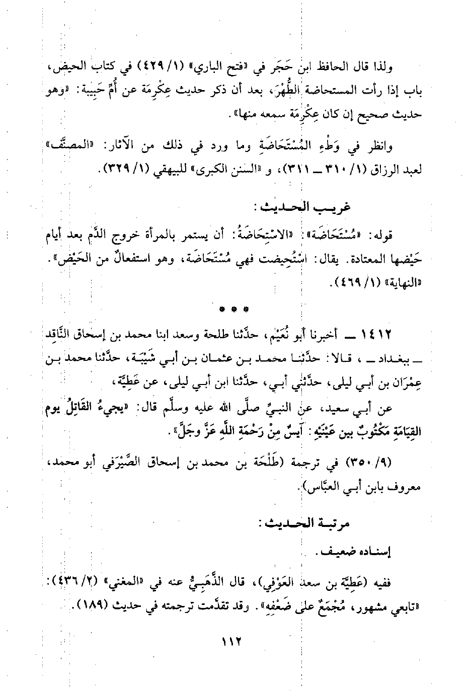 ١٤١٢ - أخبرنا أبو نُعَيْم، حدَّثنا طلحة وسعد ابنا محمد بن إسحاق النَّاقِد -ببغداد-، قالا: حدَّثنا محمد بن عثمان بن أبي شَيْبَة، حدَّثنا محمد بن عِمْرَان بن أبي ليلى، حدَّثني أبي، حدَّثنا ابن أبي ليلى، عن عَطِيَّة,