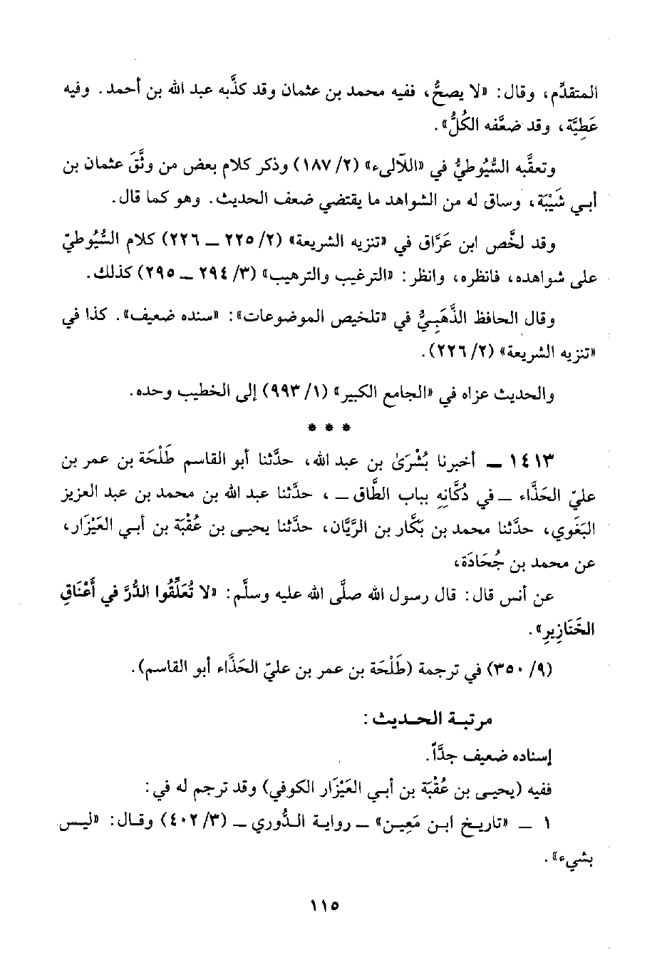 وقال الحافظ الذَّهَبِيُّ في "تلخيص الموضوعات": "سنده "ضعيف". كذا في "تنزيه الشريعة" (٢/ ٢٢٦).