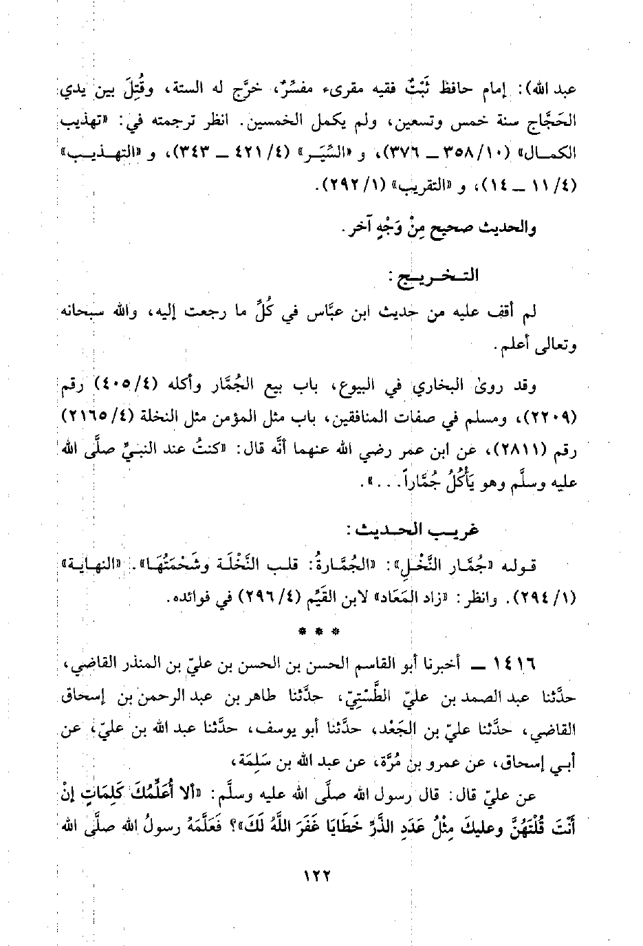 ١٤١٦ - أخبرنا أبو القاسم الحسن بن الحسن بن عليّ بن المنذر القاضي، حدَّثنا عبد الصمد بن عليّ الطَّسْتِيّ، حدَّثنا طاهر بن عبد الرحمن بن إسحاق القاضي، حدَّثنا عليّ بن الجَعْد، حدَّثنا أبو يوسف، حدَّثنا عبد اللَّه بن عليّ، عن أبي إسحاق، عن عمرو بن مُرَّة، عن عبد اللَّه بن سَلَمَة،
