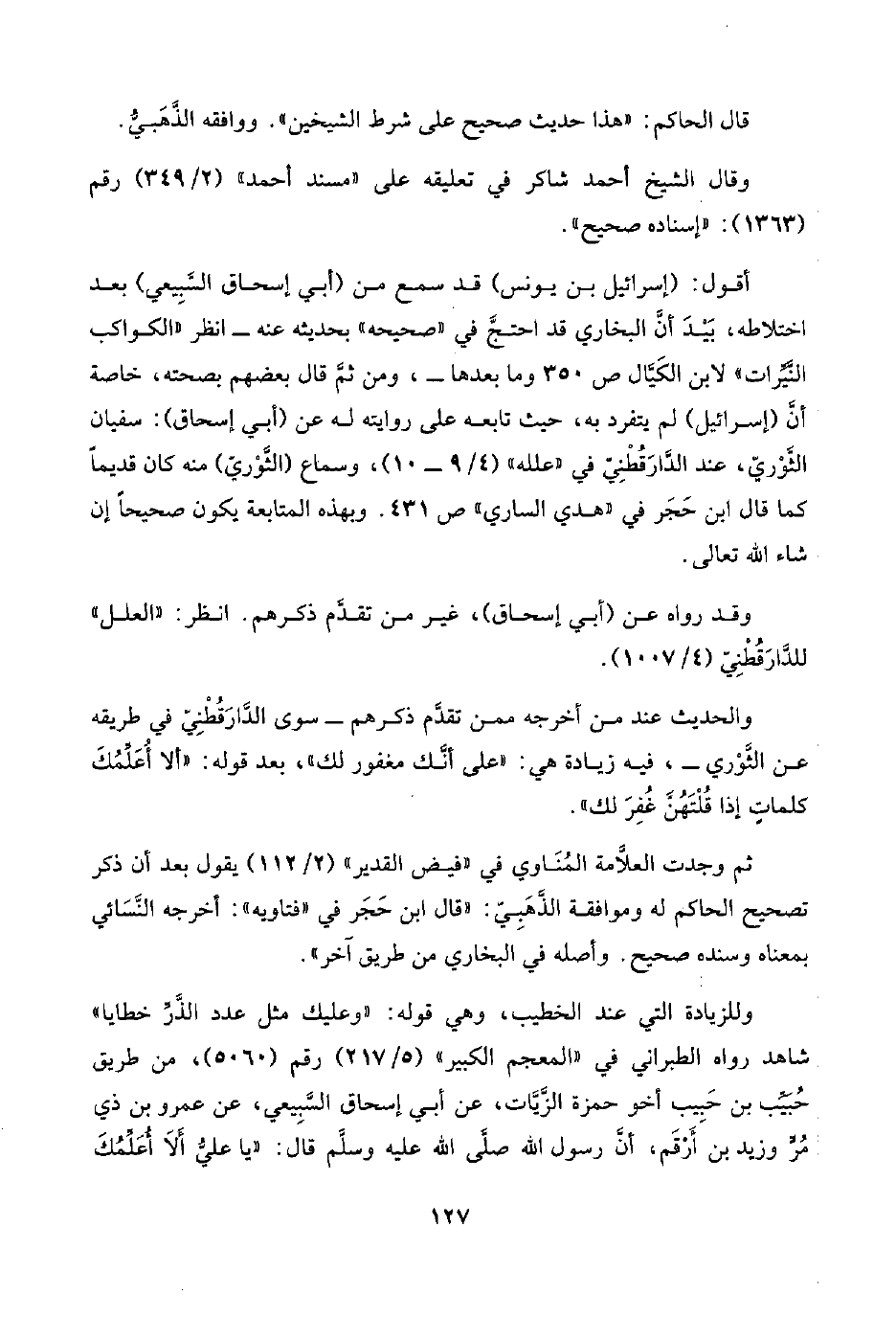 أقول: (إسرائيل بن يونس) قد سمع من (أبي إسحاق السَّبِيعي) بعد اختلاطه، بَيْدَ أنَّ البُخَاري قد احتجَّ في "صحيحه" بحديثه عنه -انظر "الكواكب النَّيِّرات" لابن الكَيَّال ص ٣٥٠ وما بعدها-، ومن ثم قال بعضهم بصحته، خاصة أن (إسرائيل) لم يتفرد به، حيث تابعه على روايته له عن (أبي إسحاق): سفيان الثَّوْري، عند الدَّارَقُطْنِيّ في "علله" (٤/ ٩ - ١٠)، وسماع (الثَّوْريّ) منه كان قديمًا كما قال ابن حَجَر في "هدي الساري" ص ٤٣١. وبهذه المتابعة يكون صحيحًا إن شاء اللَّه تعالى.