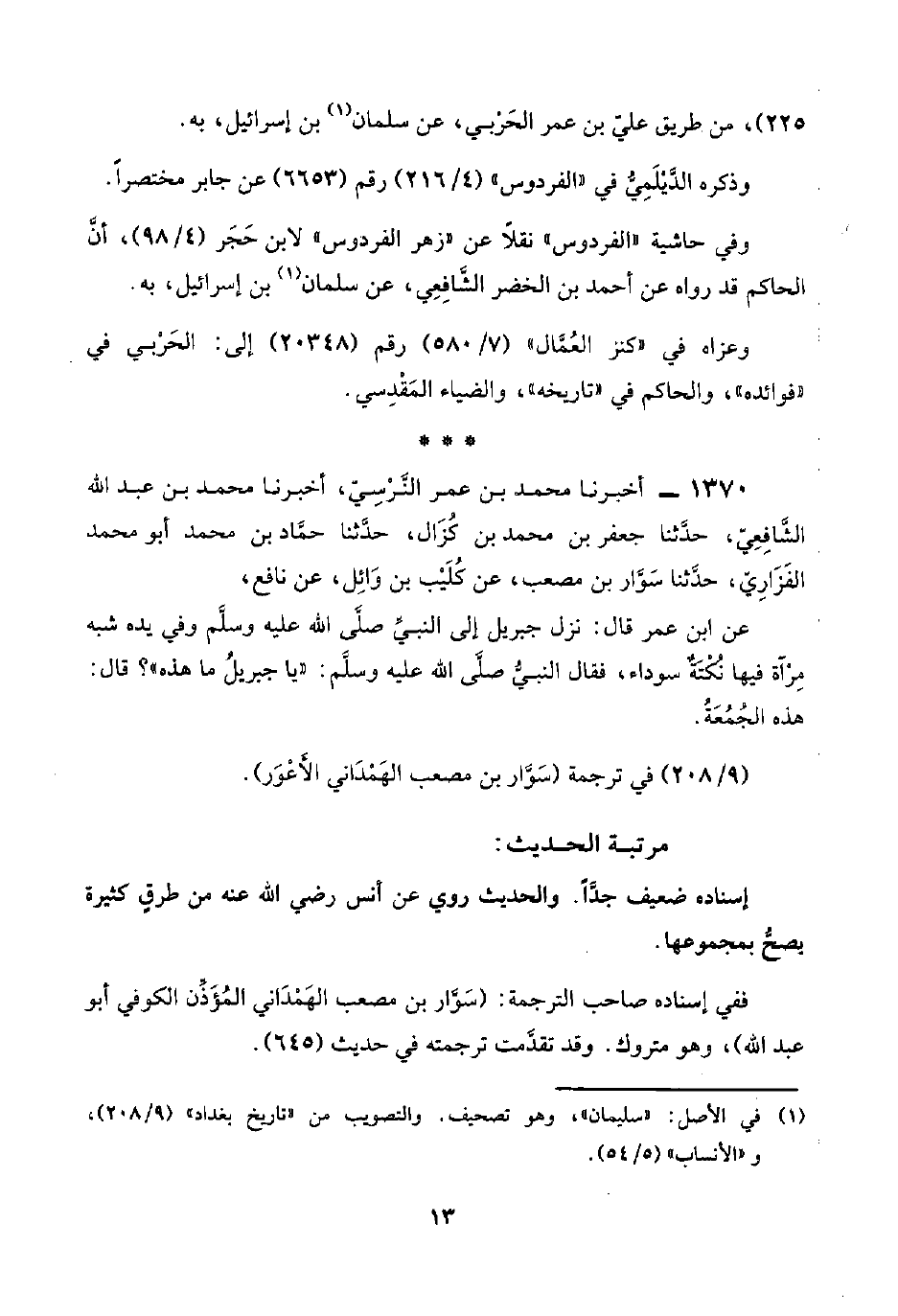 ففي إسناده صاحب الترجمة: (سَوَّار بن مصعب الهَمْدَاني المُؤَذِّن الكوفي أبو عبد اللَّه)، وهو متروك. وقد تقدَّمت ترجمته في حديث (٦٤٥).