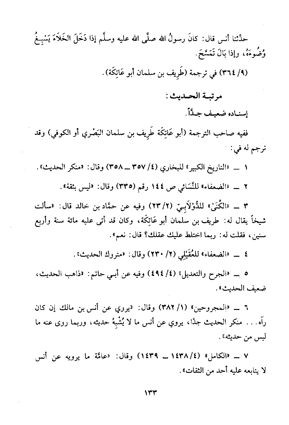 ٧ - "الكامل" (٤/ ١٤٣٨ - ١٤٣٩) وقال: "عامَّة ما يرويه عن أنس لا يتابعه عليه أحد من الثقات".