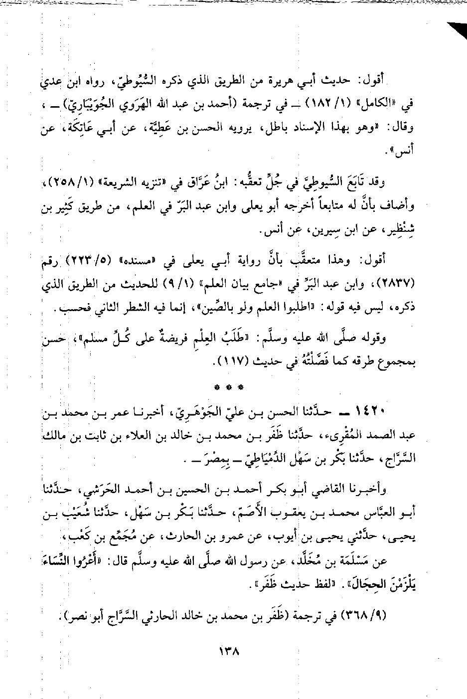 ١٤٢٠ - حدَّثنا الحسن بن عليّ الجَوْهَرِيّ، أخبرنا عمر بن محمد بن عبد الصمد المُقْرِئ، حدَّثنا ظَفَر بن محمد بن خالد بن العلاء بن ثابت بن مالك السَّرَّاج، حدَّثنا بَكْر بن سَهْل الدِّمْيَاطِيّ -بِمِصْرَ-.