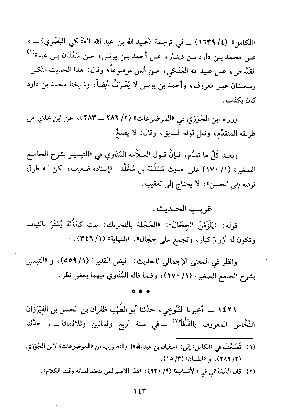 "الكامل" (٤/ ١٦٣٩) -في ترجمة (عبيد اللَّه بن عبد اللَّه العَتَكي البَصْري) -، عن محمد بن داود بن دينار، عن أحمد بن يونس، عن سَعْدَان بن عبدة (¬١) القَدَّاحي، عن عبيد اللَّه العَتَكي، عن أنس مرفوعًا؛ وقال: هذا الحديث منكر. وسعدان غير معروف، وأحمد بن يونس لا يُعْرَفُ أيضًا، وشيخنا محمد بن داود كان يكذب.