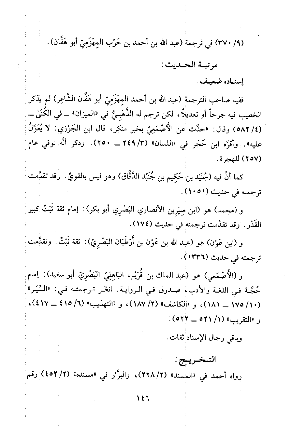 ففيه صاحب الترجمة (عبد اللَّه بن أحمد المِهْزَمِيّ أبو هَفَّان الشَّاعِر) لم يذكر الخطيب فيه جرحًا أو تعديلًا، لكن ترجم له الذَّهَبِيُّ في "الميزان" -في الكُنَى- (٤/ ٥٨٢) وقال: "حدَّث عن الأَصْمَعِيّ بخبر منكر، قال ابن الجَوْزي: لا يُعَوَّلُ عليه". وأقرَّه ابن حَجَر في "اللسان" (٣/ ٢٤٩ - ٢٥٠) وذكر أنَّه توفي عام (٢٥٧) للهجرة.