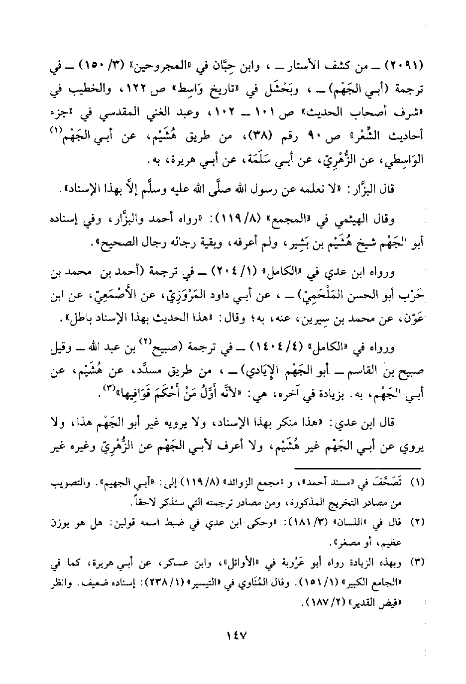 قال ابن عدي: "هذا منكر بهذا الإسناد، ولا يرويه غير أبو الجَهْم هذا، ولا يروي عن أبي الجَهْم غير هُشَيْم، ولا أعرف لأبي الجَهْم عن الزُّهْرِيّ وغيره غير