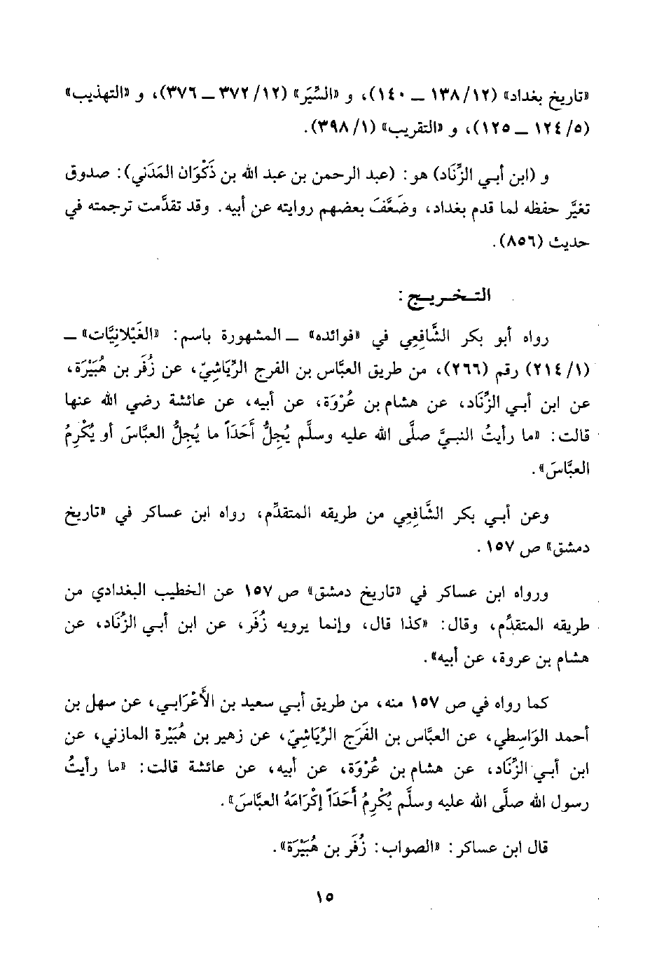 كما رواه في ص ١٥٧ منه، من طريق أبي سعيد بن الأَعْرَابي، عن سهل بن أحمد الوَاسِطي، عن العبَّاس بن الفَرَج الرِّيَاشِيّ، عن زهير بن هُبَيْرَة المازني، عن ابن أبي الزِّنَاد، عن هشام بن عُرْوَة، عن أبيه، عن عائشة قالت: "ما رأيتُ رسول اللَّه صلَّى اللَّه عليه وسلَّم يُكْرِمُ أَحَدًا إكْرَامَهُ العبَّاس".
