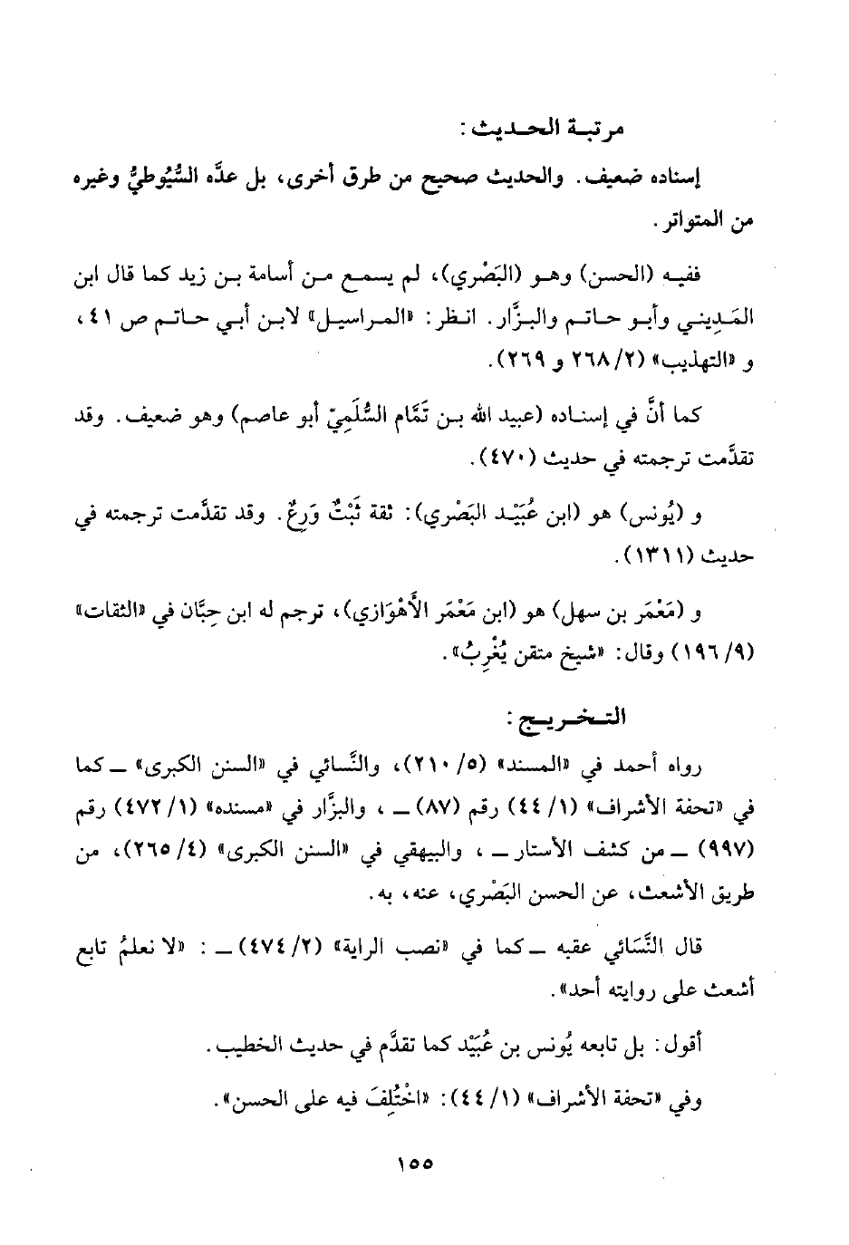 رواه أحمد في "المسند" (٥/ ٢١٠)، والنَّسَائي في "السنن الكبرى" -كما في "تحفة الأشراف" (١/ ٤٤) رقم (٨٧) -، والبزَّار في "مسنده" (١/ ٤٧٢) رقم (٩٩٧) -من كشف الأستار-، والبيهقي في "السنن الكبرى" (٤/ ٢٦٥)، من طريق الأشعث، عن الحسن البَصْري، عنه، به.