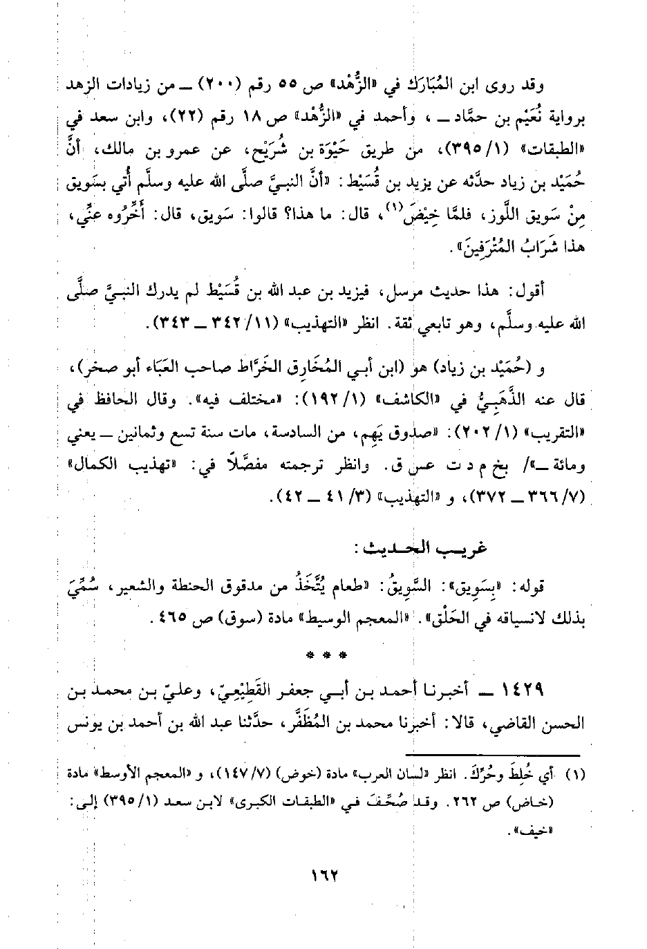 وقد روى ابن المُبَارَك في "الزُّهْد" ص ٥٥ رقم (٢٠٠) -من زيادات الزهد برواية نُعَيْم بن حمَّاد-، وأحمد في "الزُّهْد" ص ١٨ رقم (٢٢)، وابن سعد في "الطبقات" (١/ ٣٩٥)، من طريق حَيْوَة بن شُرَيْح، عن عمرو بن مالك، أنَّ حُمَيْد بن زياد حدَّثه عن يزيد بن قُسَيْط: "أنَّ النبيَّ صلَّى اللَّه عليه وسلَّم أُتي بسَويق مِنْ سَويق اللَّوز، فلمَّا خِيْضَ (¬١)، قال: ما هذا؟ قالوا: سَويق، قال: أَخِّرُوه عنِّي، هذا شَرَابُ المُتْرَفِينَ".