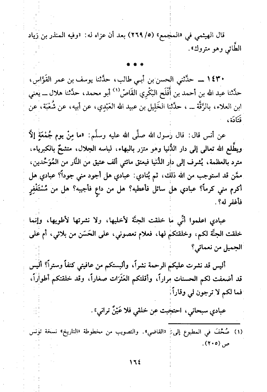 ١٤٣٠ - حدَّثني الحسن بن أبي طالب، حدَّثنا يوسف بن عمر القَوَّاس، حدَّثنا عبد اللَّه بن أحمد بن أَفْلَح البَكْرِي القَاصّ (¬١) أبو محمد، حدَّثنا هلال -يعني ابن العلاء، بالرَّقَّة-، حدَّثنا الخَلِيل بن عبيد اللَّه العَبْدِي، عن أبيه، عن شُعْبَة، عن قَتَادَة،