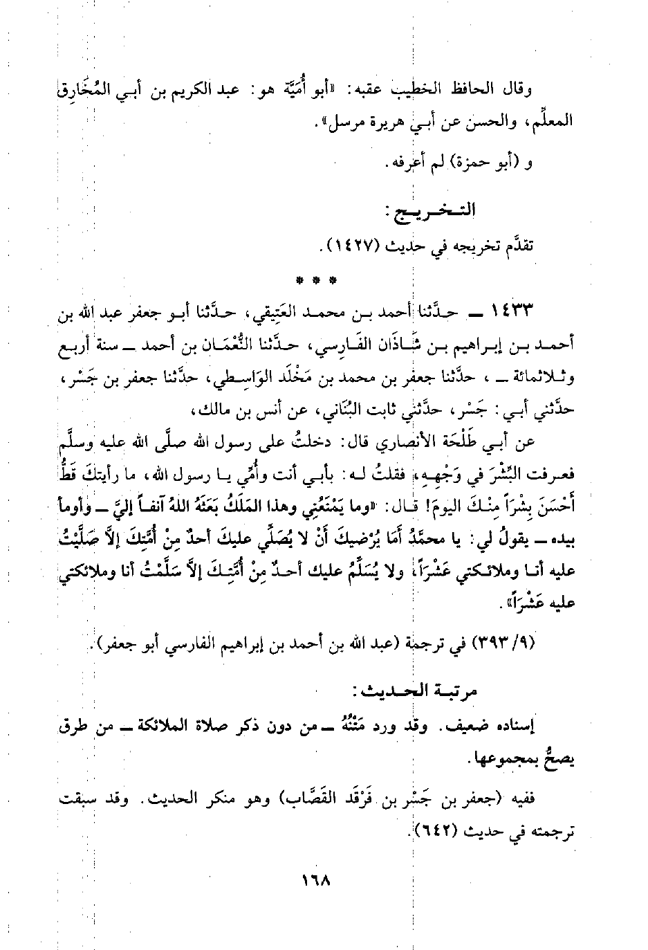 ١٤٣٣ - حدَّثنا أحمد بن محمد العَتِيقي، حدَّثنا أبو جعفر عبد اللَّه بن أحمد بن إبراهيم بن شَاذَان الفَارِسي، حدَّثنا النُّعْمَان بن أحمد -سنة أربع وثلاثمائة-، حدَّثنا جعفر بن محمد بن مَخْلَد الوَاسِطي، حدَّثنا جعفر بن جَسْر، حدَّثني أبي: جَسْر، حدَّثني ثابت البُنَاني، عن أنس بن مالك،