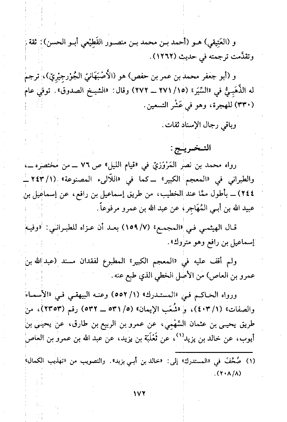 رواه محمد بن نصر المَرْوَزِيّ في "قيام الليل" ص ٧٦ - من مختصره-، والطبراني في "المعجم الكبير" -كما في "اللآلئ المصنوعة" (١/ ٢٤٣ - ٢٤٤) - بأطول ممَّا عند الخطيب، من طريق إسماعيل بن رافع، عن إسماعيل بن عبيد اللَّه بن أبي المُهَاجِر، عن عبد اللَّه بن عمرو مرفوعًا.