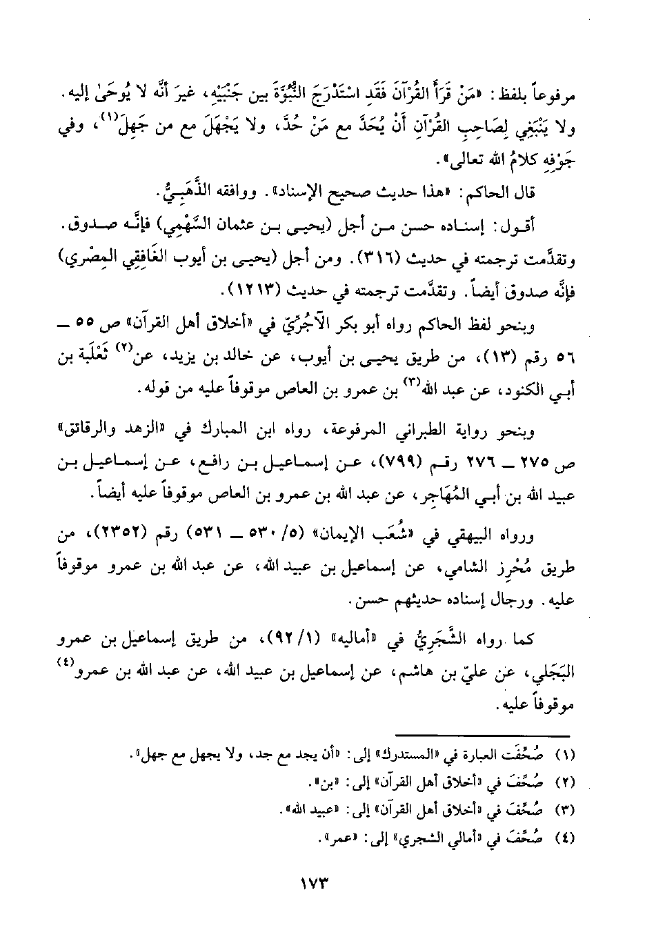 وبنحو لفظ الحاكم رواه أبو بكر الآجُرِّيّ في "أخلاق أهل القرآن" ص ٥٥ - ٥٦ رقم (١٣)، من طريق يحيى بن أيوب، عن خالد بن يزيد، عن (¬٢) ثَعْلَبة بن أبي الكنود، عن عبد اللَّه (¬٣) بن عمرو بن العاص موقوفًا عليه من قوله.