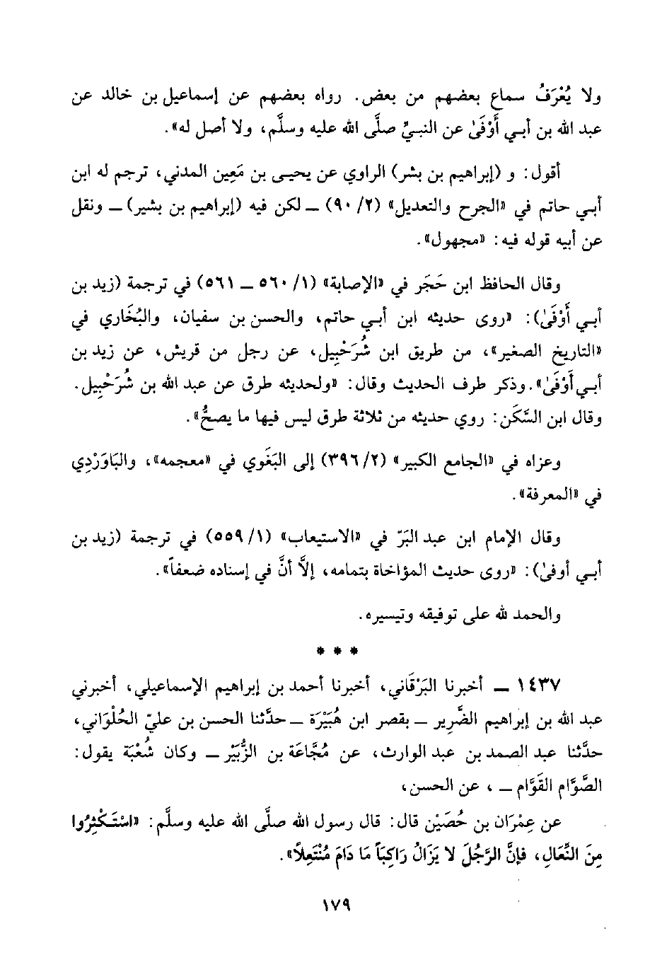 وقال الحافظ ابن حَجَر في "الإصابة" (١/ ٥٦٠ - ٥٦١) في ترجمة (زيد بن أبي أَوْفَى): "روى حديثه ابن أبي حاتم، والحسن بن سفيان، والبُخَاري في "التاريخ الصغير"، من طريق ابن شُرَحْبِيل، عن رجل من قريش، عن زيد بن أبي أَوْفَى". وذكر طرف الحديث وقال: "ولحديثه طرق عن عبد اللَّه بن شُرَحْبِيل. وقال ابن السَّكَن: روي حديثه من ثلاثة طرق ليس فيها ما يصحُّ".