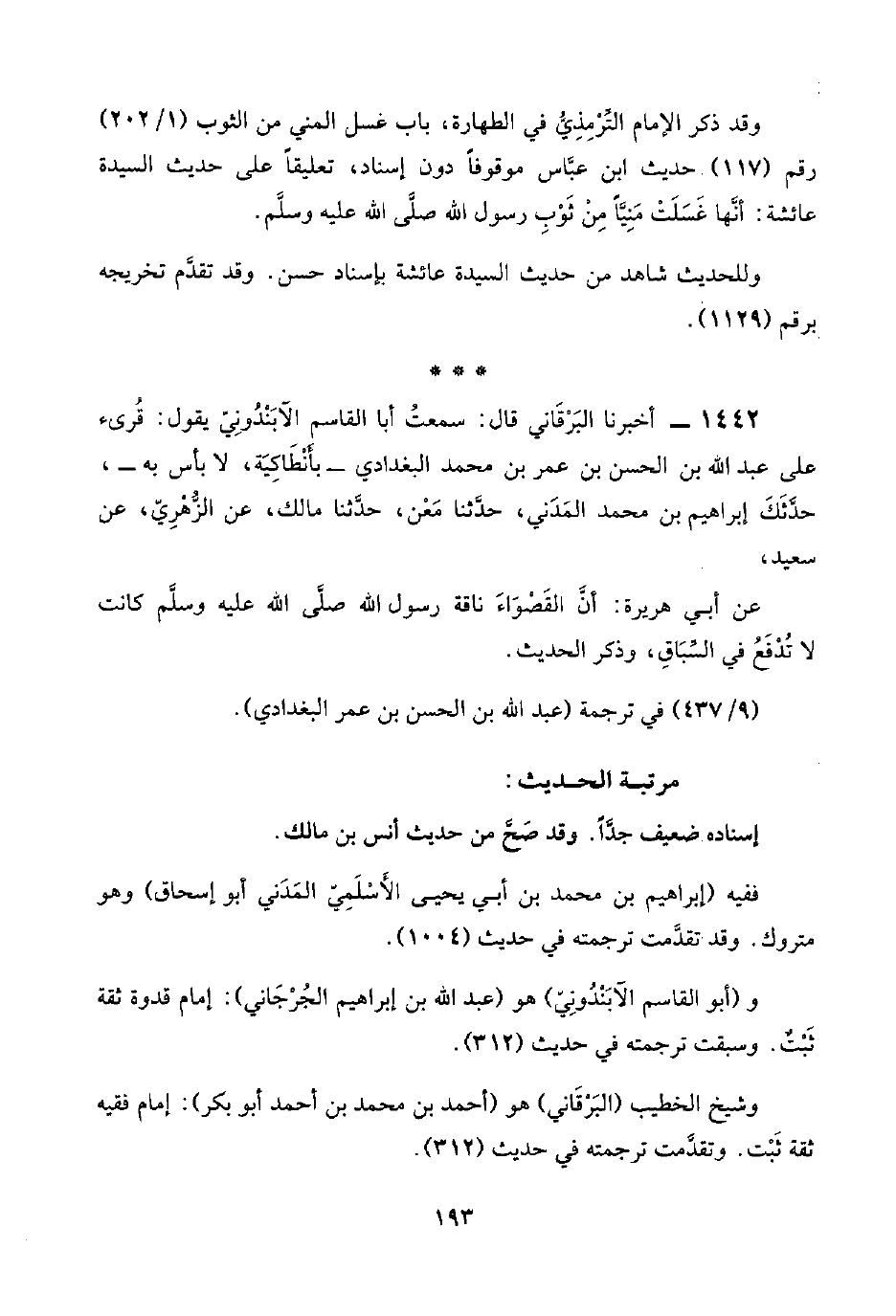 ١٤٤٢ - أخبرنا البَرْقَاني قال: سمعتُ أبا القاسم الآبَنْدُونِيّ يقول: قُرِئ على عبد اللَّه بن الحسن بن عمر بن محمد البغدادي -بأَنْطَاكِيَة، لا بأس به-، حدَّثَكَ إبراهيم بن محمد المَدَني، حدَّثنا مَعْن، حدَّثنا مالك، عن الزُّهْرِيّ، عن سعيد،