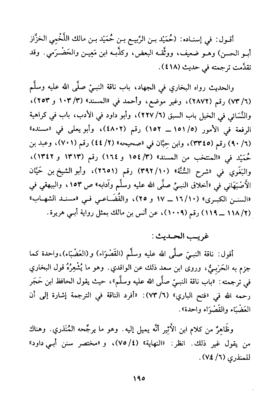 أقول: ناقة النبيّ صلَّى اللَّه عليه وسلَّم (القَصَوَاءَ) و (العَضْبَاء)، واحدة كما جزم به الحَرْبِيُّ، وروى ابن سعد ذلك عن الوَاقِدِي. وهو ما يُشْعِرُهُ قول البُخَاري في ترجمته: "باب ناقة النبيّ صلَّى اللَّه عليه وسلَّم"، حيث يقول الحافظ ابن حَجَر رحمه اللَّه في "فتح الباري" (٦/ ٧٣): "أفرد الناقة في الترجمة إشارة إلى أن العَضْبَاء والقَصَواءَ واحدة".