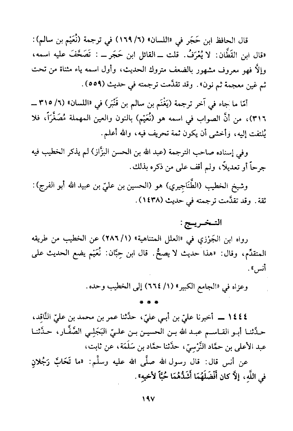 ١٤٤٤ - أخبرنا عليّ بن أبي عليّ، حدَّثنا عمر بن محمد بن عليّ النَّاقِد، حدَّثنا أبو القاسم عبد اللَّه بن الحسين بن عليّ البَجَلي الصَّفَّار، حدَّثنا عبد الأعلى بن حمَّاد النَّرْسِيّ، حدَّثنا حمَّاد بن سَلَمَة، عن ثابت،