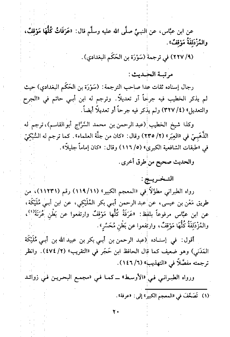 رواه الطبراني مطوَّلًا في "المعجم الكبير" (١١/ ١١٩) رقم (١١٢٣١)، من طريق مَعْن بن عيسى، عن عبد الرحمن أبي بكر المُلَيْكِي، عن ابن أبي مُلَيْكَة، عن ابن عبَّاس مرفوعًا بلفظ: "عَرَفَةُ كُلُّها مَوْقِفٌ وارتفعوا عن بَطْنِ عُرَنَةَ (¬١)، والمُزْدَلِفَةُ كُلُّهَا مُوْقِفٌ، وارتفعوا عن بَطْنِ مُحَسِّرٍ".
