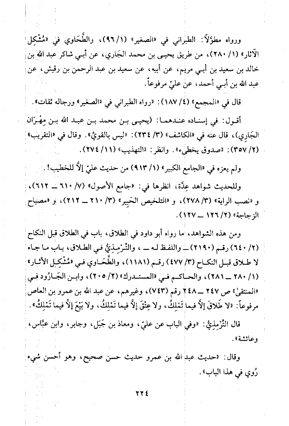 ومن هذه الشواهد، أما رواه أبو داود في الطلاق، باب في الطلاق قبل النكاح (٢/ ٦٤٠) رقم (٢١٩٠) -واللفظ له-، والتِّرْمِذِيُّ في الطلاق، باب ما جاء لا طلاق قبل النكاح (٣/ ٤٧٧) رقم (١١٨١)، والطَّحَاوي في "مُشْكِل الآثار" (١/ ٢٨٠ - ٢٨١)، والحاكم في "المستدرك" (٢/ ٢٠٥)، وابن الجَارُود في "المنتقى" ص ٢٤٧ - ٢٤٨ رقم (٧٤٣)، وغيرهم، عن عبد اللَّه بن عمرو بن العاص مرفوعًا: "لا طَلاقَ إلَّا فيما تَمْلِكُ، ولا عِنْقَ إلَّا فيما تَمْلِكُ، ولا بَيْعَ إلَّا فيما تَمْلِكُ".