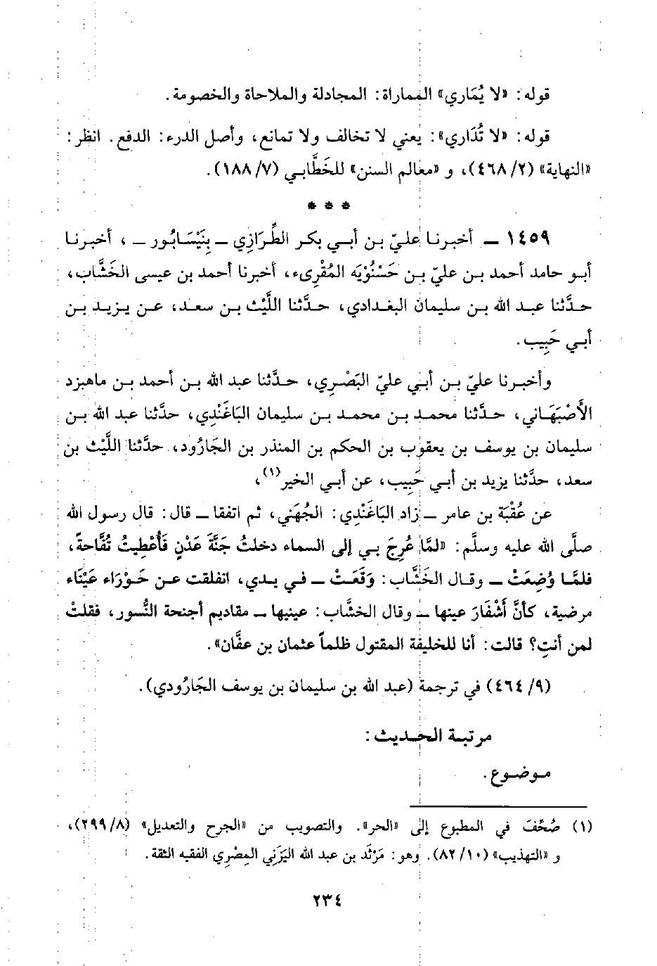 ١٤٥٩ - أخبرنا عليّ بن أبي بكر الطِّرَازِي -بِنَيْسَابُور-، أخبرنا أبو حامد أحمد بن عليّ بن حَسْنُوْيَه المُقْرِئ، أخبرنا أحمد بن عيسى الخَشَّاب، حدَّثنا عبد اللَّه بن سليمان البغدادي، حدَّثنا اللَّيْث بن سعد، عن يزيد بن أبي حَبِيب.